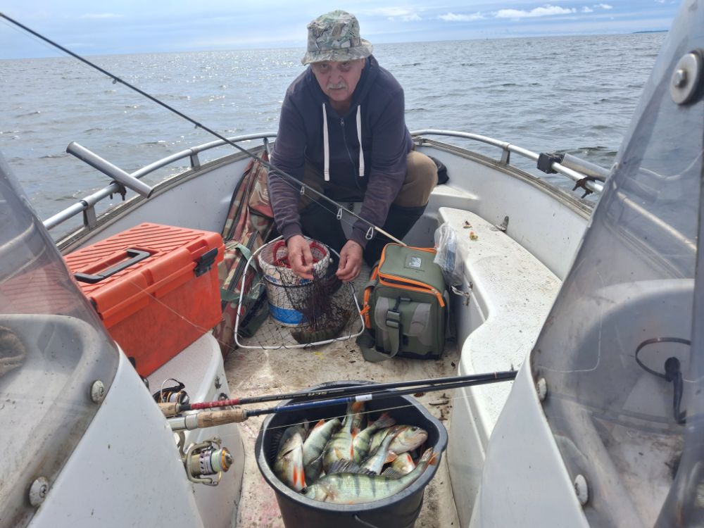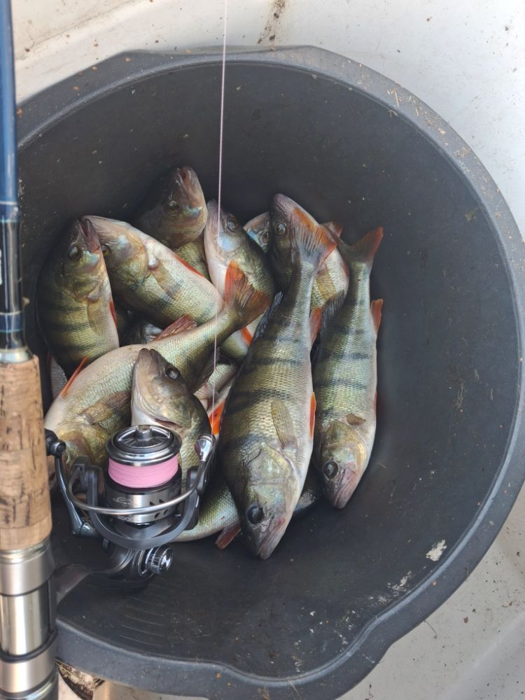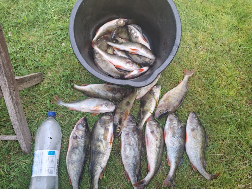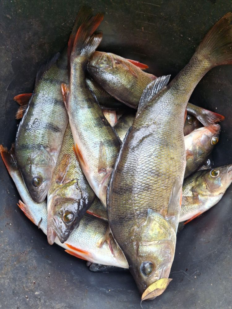 Ветер терпимый , дождь местами , окунь так же , но размер хороший , коту даже мелочи не было .
