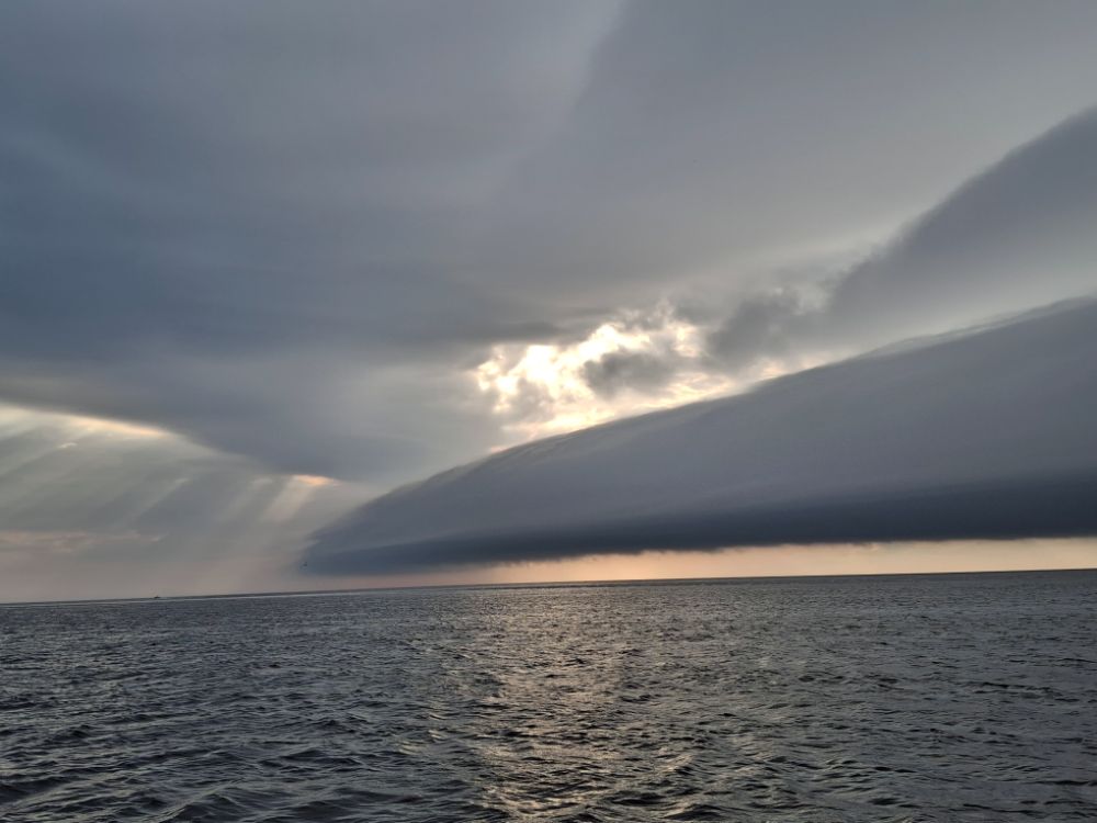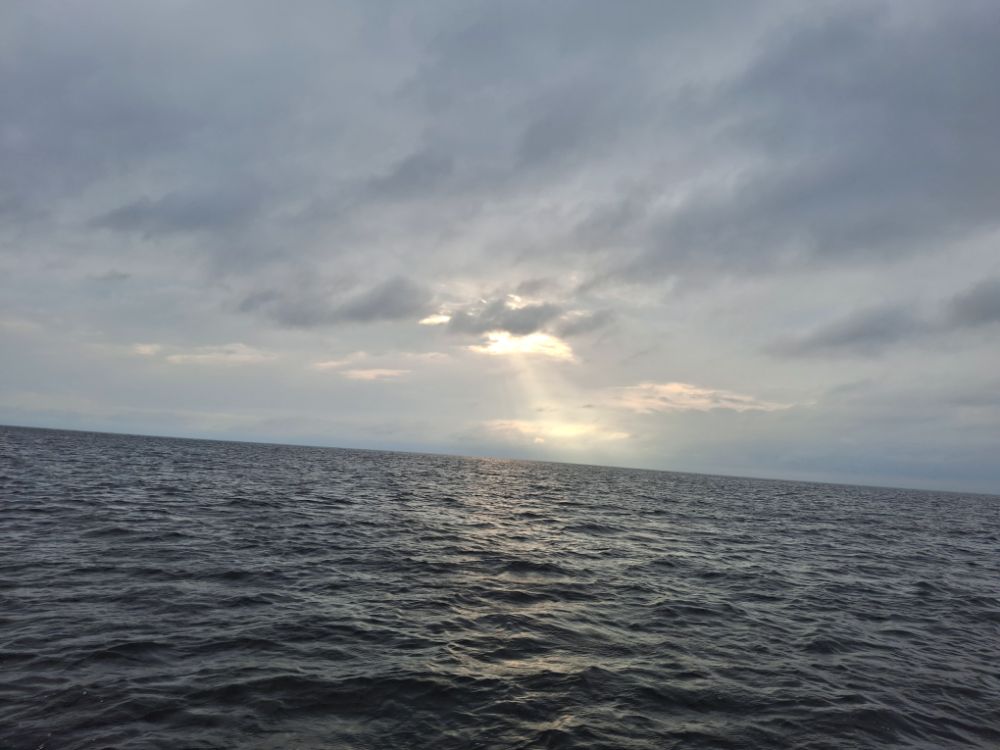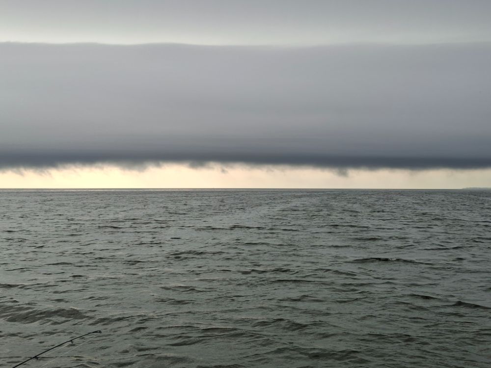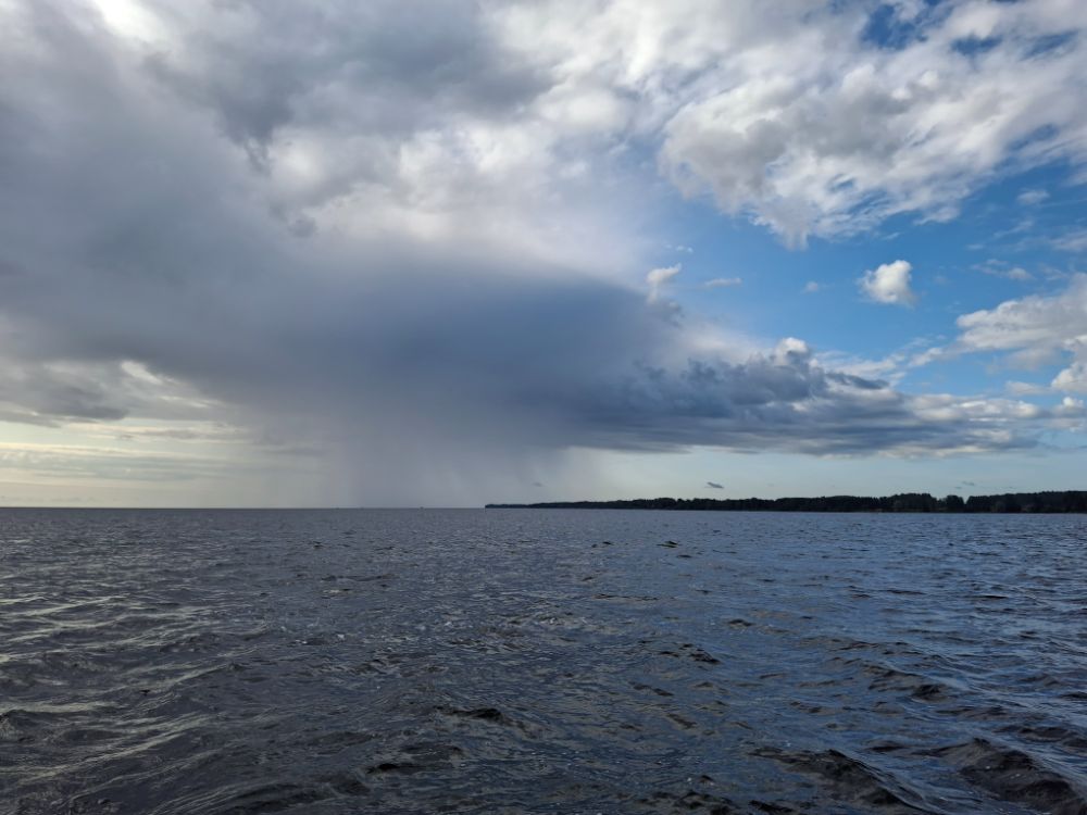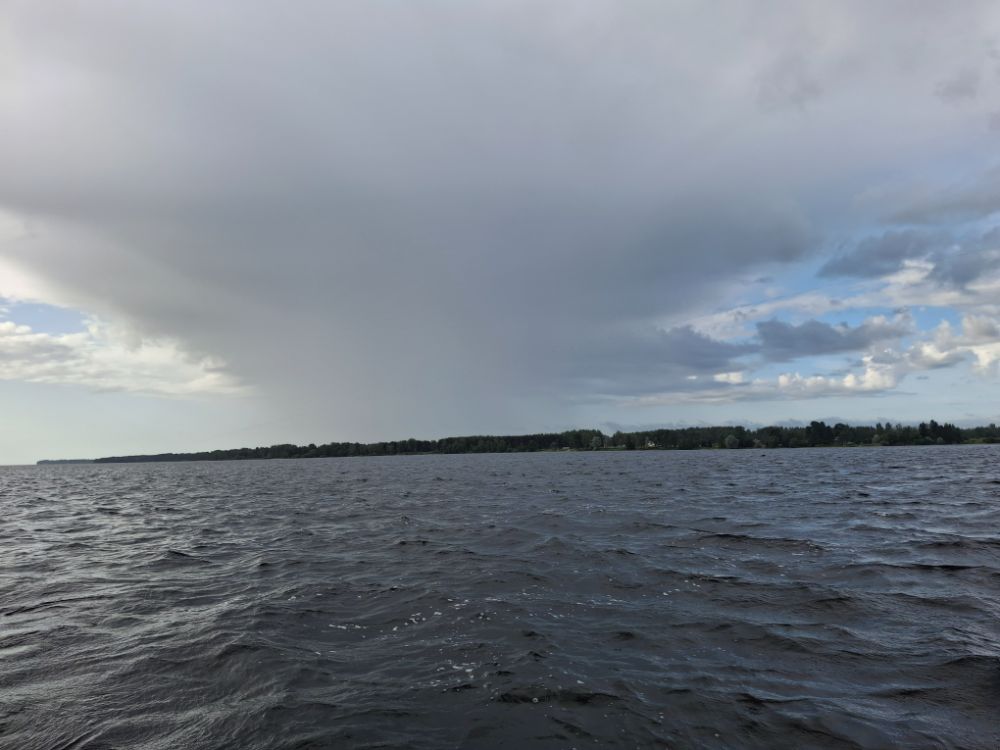 Прогнозы погоды сбылись на половину , дождь с утра , да был , гремело , да , Встал с утра , вроде терпимо , пасмурно , дождя нет , только дошёл до лодки , ливануло как из ведра , ну и прогрохотало в недалече , посидел под ивой могучей , подстихло , запустился не доходя моста , снова плоснуло , постоял под мостом пока не подстихло .Дальше думаю смотаться на 5 км вроде тихо , ветерок южный не кретичный, только вывалился за третий , раздуло так что подойдя к точке , ну его нах , скакать по волнам , пошлепал на юг , против волны ближе к берегу , Ну и там вдоль берега на дальние точки , только туда дошёл, ветер меняется в противоположную сторону , да и такой не хилый метров под 6 и главное , чую стихать не собирается , а до дому пилить больше 10 км против волны . Кое как дошлепал , думал под берегом потише , , да чутка потише , но чёт решил хватит качатся , нарыбалтлся.