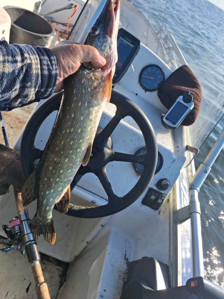 Проверял свои ближнии места , с окунем в заброс вроде все понятно , решил продорожить , ветер с дождём в спину , не так критично, типа закончится дождь , поверну назад .окушке влетают , шансон в ушах , шум дождя сбивает , ляпота , тут загиб, вроде зацеп , но дёргается, типа в траву затащили, но потом понял , что то хорошее , к лодке не хотела подходить , но все же подвёл, на вид за пятеру , с дуру решил окуневым подсаком , думал как нибудь влезет , ну а дальше классика , воблер за мотню подсака одним тройником цепляется , щука не влазит в подсак, кольцо на втором тройнике разгибается и щука с троиником машет мне плавником .