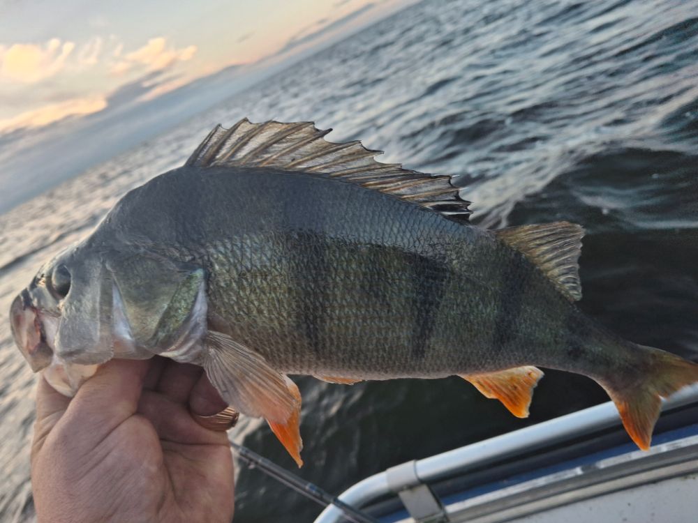 Погода сказка , почти штиль , недолго думая на дальние точки , Рыб не сразу но отозвался , опять в фаворе одно железо , резину просто игнорирует , ну и окунь порадовал мелочи пару штук остальное средний хороший окунь , под конец сход у лодки просто монстра , поднять не смог , видно за губу засекся и не выдержала веса .