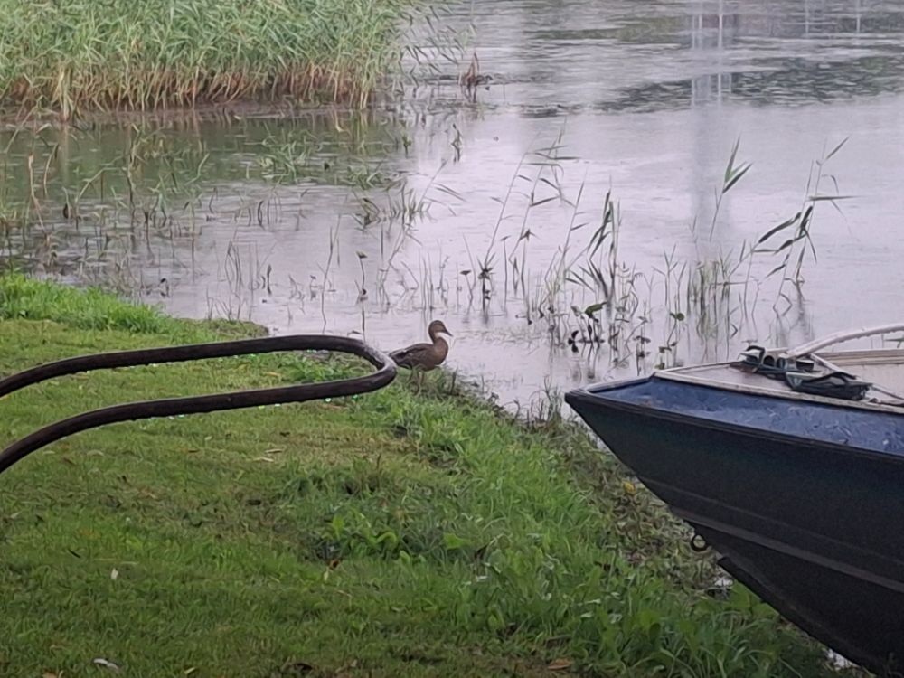 Прогнозы погоды сбылись на половину , дождь с утра , да был , гремело , да , Встал с утра , вроде терпимо , пасмурно , дождя нет , только дошёл до лодки , ливануло как из ведра , ну и прогрохотало в недалече , посидел под ивой могучей , подстихло , запустился не доходя моста , снова плоснуло , постоял под мостом пока не подстихло .Дальше думаю смотаться на 5 км вроде тихо , ветерок южный не кретичный, только вывалился за третий , раздуло так что подойдя к точке , ну его нах , скакать по волнам , пошлепал на юг , против волны ближе к берегу , Ну и там вдоль берега на дальние точки , только туда дошёл, ветер меняется в противоположную сторону , да и такой не хилый метров под 6 и главное , чую стихать не собирается , а до дому пилить больше 10 км против волны . Кое как дошлепал , думал под берегом потише , , да чутка потише , но чёт решил хватит качатся , нарыбалтлся.