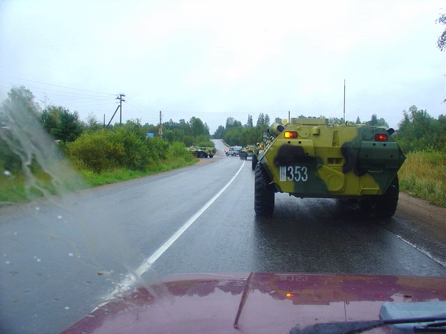 Пока ехали, чуть не были раздавлены колонной БТРов, все новенькие. Приехали на место, разгрузились, и в лес.