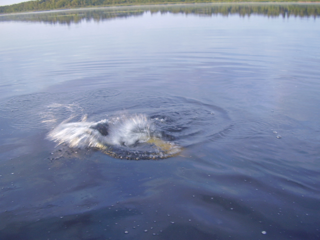 Слегка подустал от лазания по бурелому. Заехал по указателю на одно озерко. Оказалось приличным каръером с красивыми берегами, прозрачной водой и кувнинками. Искупался и решил для разнообразия чуть покидать. Поставил самый крупный из имеющихся с собой форелевых вобов и начал твичить. Через несколько минут удар, щучка около килограмма мечется на ул спининге. Не форсируя, подвожу ее к берегу, вижу что небольшой тройничок едва держится за кожу нижней челюсти. Уже в 10 см от берега, когда я протянул руку чтобы взять за жабры и представил ее отфилированной в фольге да со сметаной