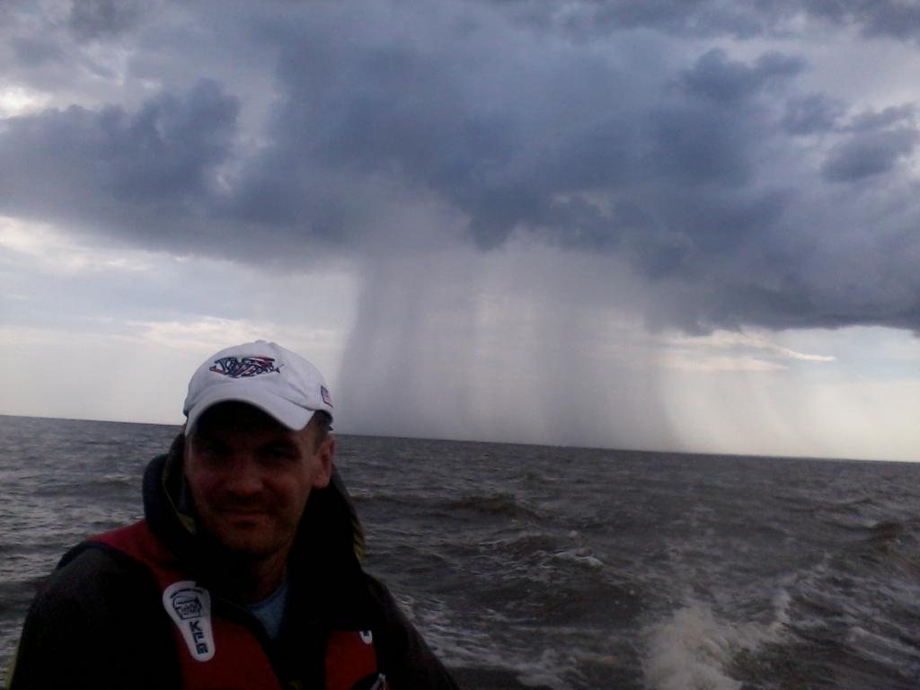 Пятница. Было гораздо интересней и по рыбе и по погоде.До обеда полный штиль,сидишь в лодке за 5-7км от берега ,как в большом пруду (и не море вовсе).Солнце жарит,вода - зеркало,покрытое зеленой цветущей массой.После обеда всё затянуло и нас накрыло дождём три раза.После третьего раза увидев на горизонте такую Фокусиму решили проверить кто быстрее мы,или туча.В 16.00 были на берегу.Там уже готовился к выходу на вечёрку очередной экипаж в составе Володи с напарником.По рыбе в Таллинн поехало 15 хвостов ,самый большой 1.2,амнистировано около 30-ки.С утра судак почти весь мерный был,а как солнце вылезло одни дети пошли. У некоторых местных профи уловы относительно нашего можно смело помножить на 3.Есть к чему стремиться