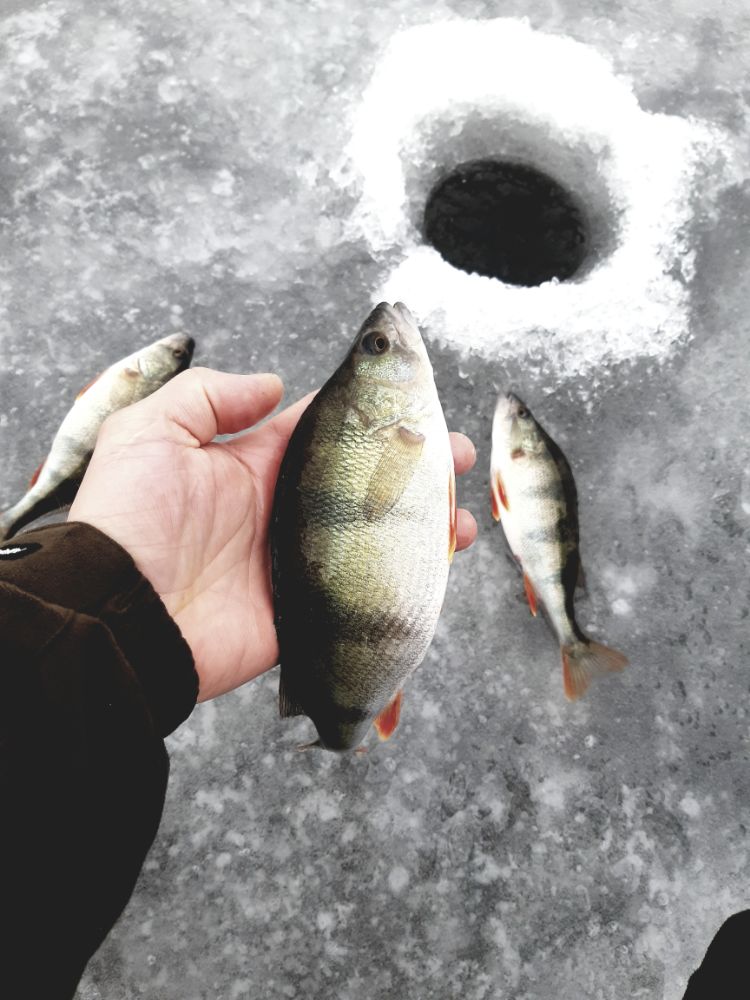 Сегодня опять почти без рыбы. В каждой лунке по1-3 мизерных окушка. Получился один дуплетик,думал что красавец окунь будет