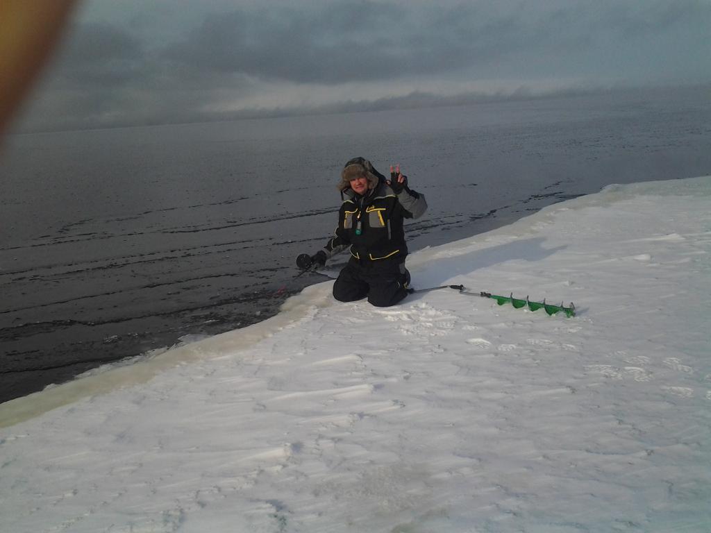 Во вторник и пятницу был на заливе там же....Лед потихоньку сдает свои позиции. Бывший свежий лед(он черного цвета) особенно подвержен изменениям...он был где-то 25см,а сейчас по нему опасно передвигаться.Появились и промоины....Старый лед по прежнему надежен и толщина до метра.Р.ыба имеет тенденцию движения в залив,явно готовиться к нересту.В пятницу сосед поймал виновницу обрыва моих топоров- треска,потянула на 4кг...