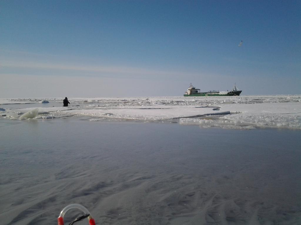Вчера выехали в сторону Пярну. В Таллинне было около -10, в 30-ти км уже -20 и температура продержалась вплоть до 7 часов. Потом на солнце начала поднимться. На машине по дороге жизни проехали на 3- км. Дальше торосы, трещины и молодой лёд. Все торосы и трещины смерзлись и ходить было нормально. Есть участки, гда лед около 30 см, совсем новый только 10-15 см. С весенним солнцем это ненадолго.