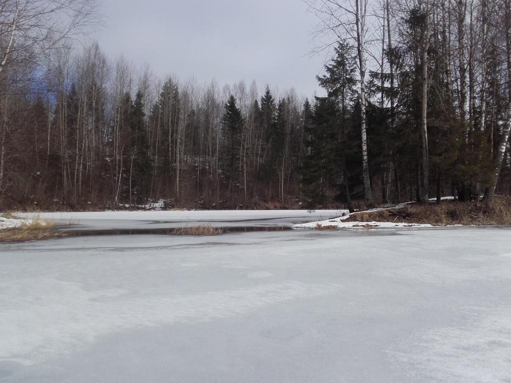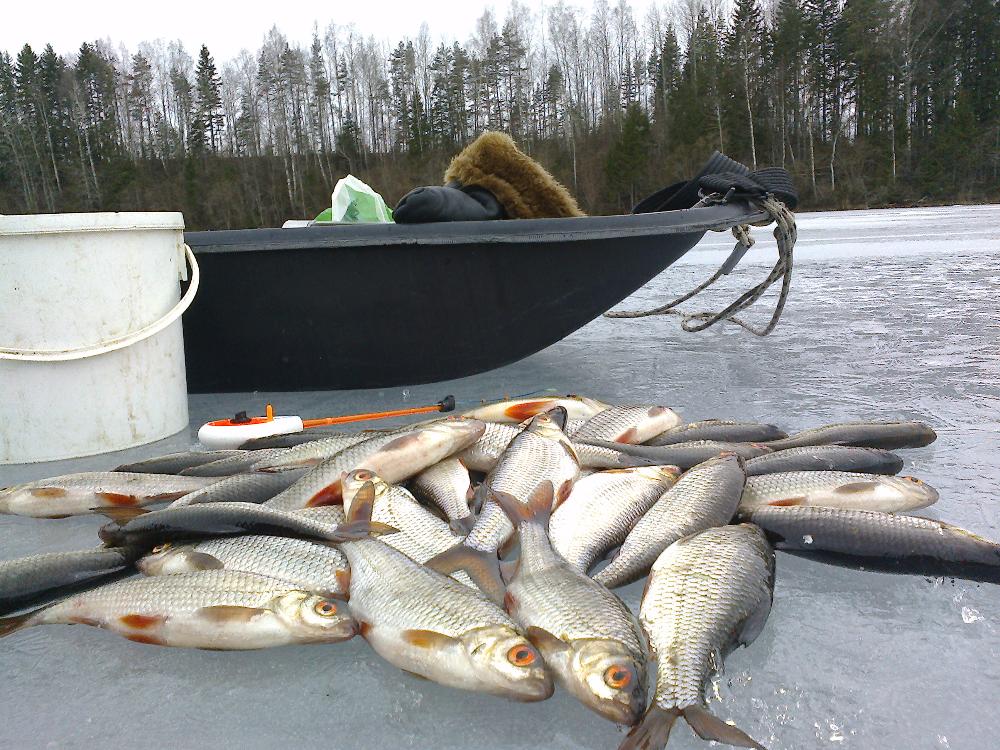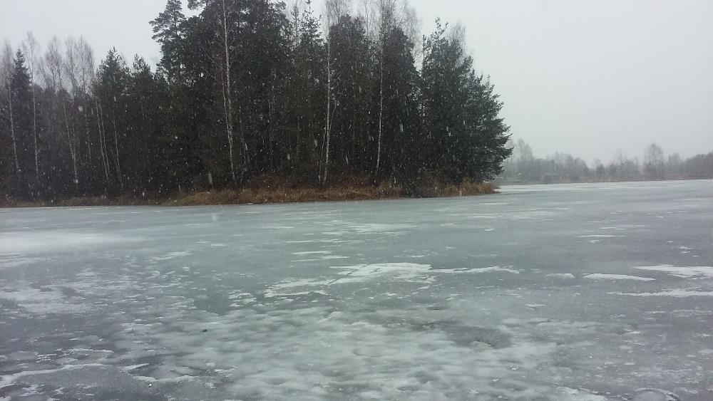 Четверг двадцать девятое.Набравшись смелости,не без пешни,забрался за второй остров.Со следующего мыса открытая вода врезается в лёд,на расстоянии метров двадцати от берега,дальше ясно ни-ни.Обстукав эту заводину,всё так же,на полтора раза бъётся.Таким же методом,из пятнадцати лунок,три отозвались.К обеду плюс явно переборол минус,белая равнина,прямо на глазах темнела.Где-то тихонько потрескивало,но такой незнакомый и не предвещавший ни чего хоршего был этот треск.Да и у лунок в радиусе двух метров от их цента,водяная каша попугивала.Страшновато,а ещё ведь обратно идти.Во втором часу отступил на вчерашние лунки.И тут потихоньку поклёвывало.Выходил в этот день,с такой же опаской,как выходил в предыдущий,затаив дыхание и тока уже на берегу выдохнул.Больше до морозов на лёд ни ногой,это уже окончательный был вердикт.Итак повезло поймал два зимних дня в конце декабря,вместе сними и адреналином запасся на долгое время,да и не без рыбки,и не без радости.Этот раз результат три десятка плотвичек и два окуня.И с котофеем поделился и на добрую жарёху ещё хватило,и даже псине жареной рыбке перепало.Все довольны,окромя детей,которым подавай рыбу сушёную.