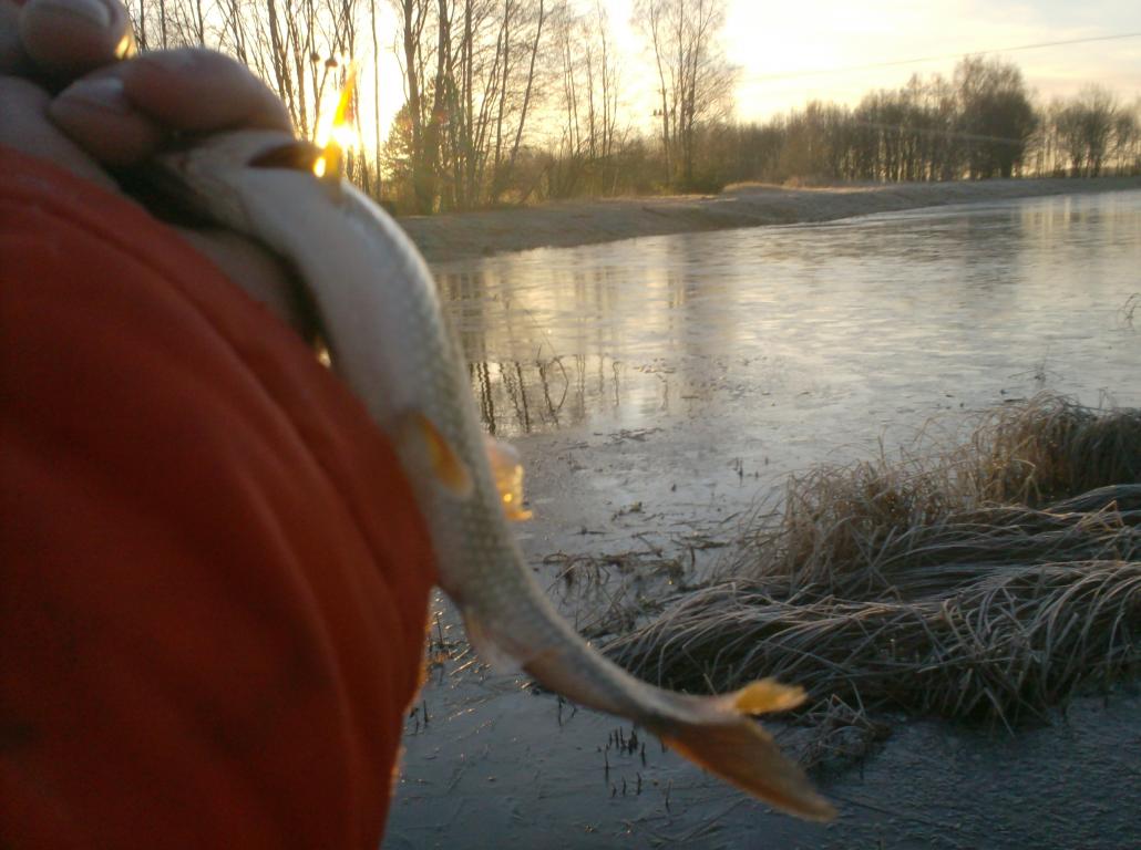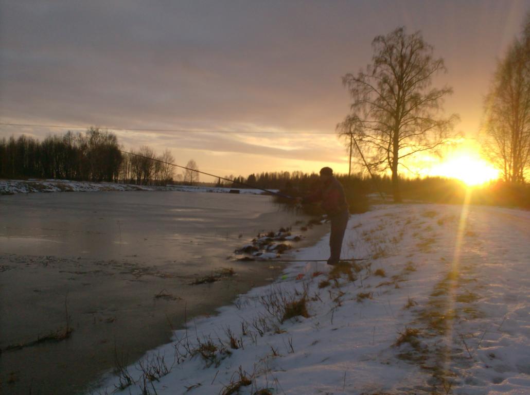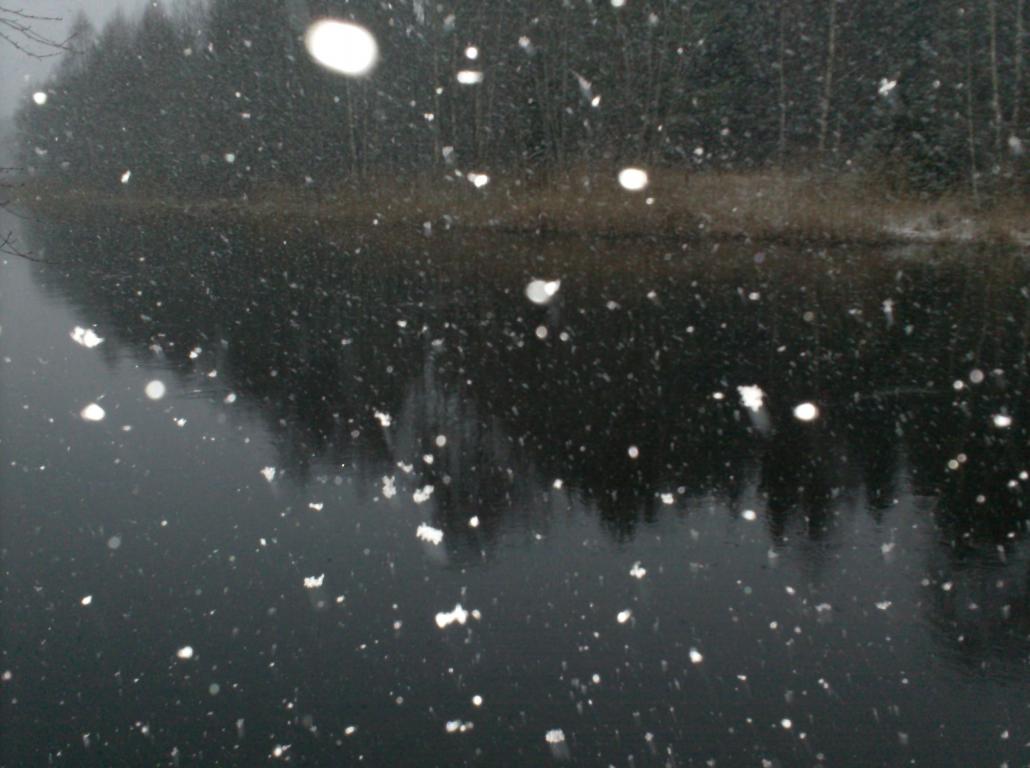 Ночью погодка,по случаю праздника видать,стала походить более на зимнюю.А тут и снежок потихоньку пошол,пошёл,да как посыпал.Стал потихоньку возвращаться ближе к машинке,пока не замело.И всё-таки не оторваться от реки.И опять,травка,обратка,выхожу на место зиг-зага.И что это?Идут вьюны,в таком месте вроде так и положено,но явно прослушиваються и всплески,не можу понять где.Пригляделся внимательней,точь в самом месте где закручивают вьюны,как-будто кто-то играет,явно не щупакабр,однако вроде рыба.А снег валит уже во всю.