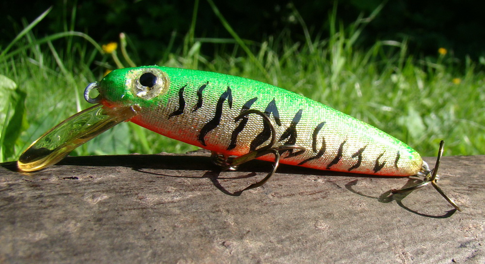 Я использовал парчу из отдела тканей. Кстати похоже и на фото поляков тоже она. Стоит дёшево. Обклеивал воблера канцелярским клеем и в лак. На зеленом позже укоротил лопасть.