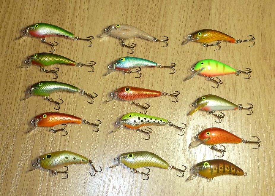 Специально для willi - отряд боевых малышей!!! Делаю их по финской технологии из абаши. Огружаю в прорезь примерно между средней и верхней петлёй. Эти малыши имеют ряд преимуществ перед другими приманками - блёснами и разного рода силиконами. Их вес от 6 до 8 грамм. Этого достаточно, что бы забрасывать их лёгким спиннингом. Все плавающие. Они не боятся редкого камыша - доведя до камыша, нужно замедлить ход, в 80% случаях зацепов избегаю. Также, можно избавится от повисшей на тройнике травины - дав воблеру всплыть. Прежде, чем забрасывать приманку - смотрю в живую на игру при разных скоростях проводки.