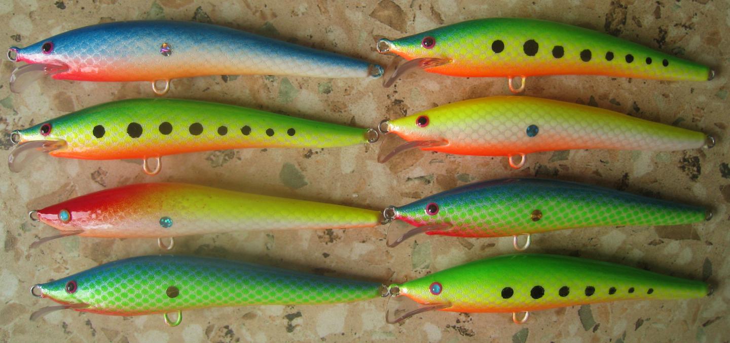 Не увидел из чего сделаны твои приманки. Если это ППУ, то скорее всего покрыта эпоксидкой (наверное 1 грамм). У них нету сплошной арматуры (тоже наверное грамм) Нету многослойного покрытия лаком (тоже где-то под грамм) Почти 3 грамма насобиралиsergei07 писал(а):Сделал два изогнутых воблера, пытался сделать их максимально легкими огрузил всего 0,5 гр свинца, получилось при размере 80 мм вес примерно 8 гр. Оригинал при размере 86 мм весит 5,9 гр. Как из пластика можно сделать такую легкую приманку?
