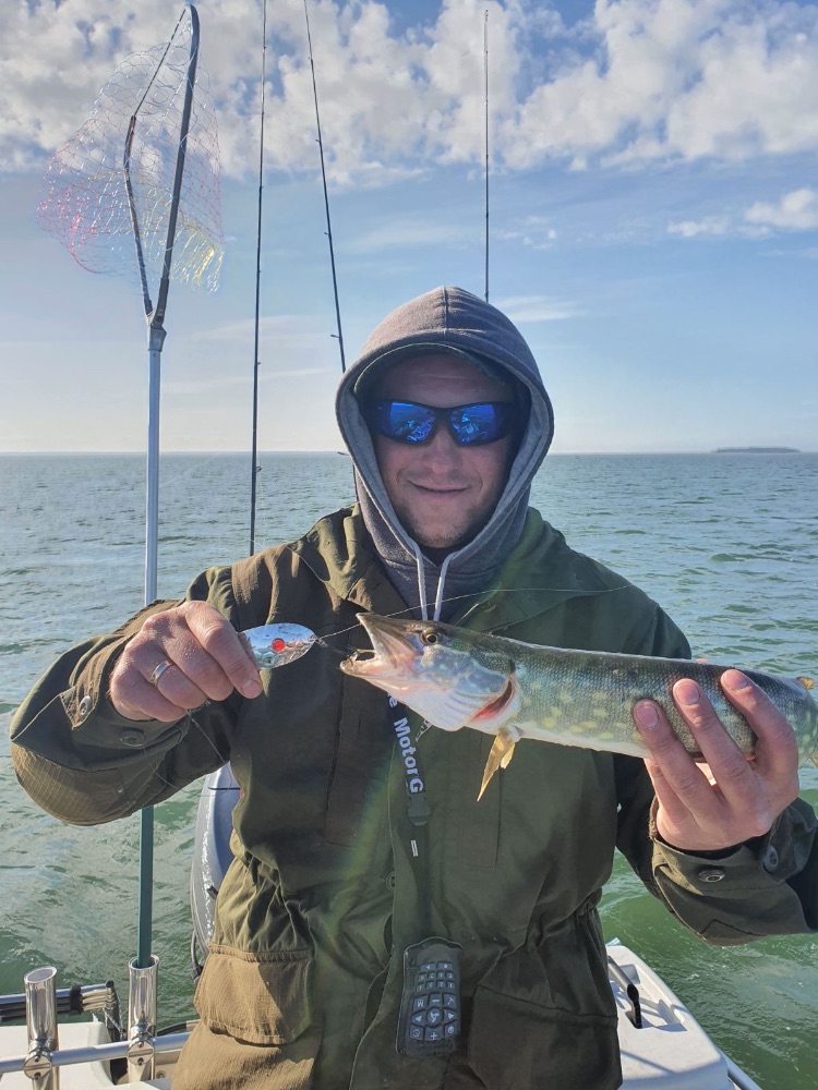 За "ветренной" щуки больше не надо, значит буду искать новые места. Пошёл на южную сторону острова. Пролез в несколько мелководных мест, а там пусто. Вода чистая, прозрачная и, без рыбы. Перебираясь с одного места на другое, тормознулся на небольшой глубине. Где то 70-90см. С первой проводки взяла небольшая щучка. Второй заброс - ещё одна сидит. Третий - и опять есть. Потом почти каждую проводку провожала рыба блесну. Взал с этого места 7 штук и решил, что хватит. Не надо мне стока рыбы. Всех щук повесил на кукан и двинулся в поиск новых мест (или стоянок рыбы). Но так больше ничего не нашёл. Были отдельные выходи, поклёвки. Несколько штук поймал с разных мест и отпустил обратно. Все пойманные были 1-1,5кг. Целый день светило солнышко. С утра было прохладно, потом потеплело. Но особенно раздеваться не хотелось. Так целый день в костюме и пробыл. Только пару раз куртку снимал. Да и то не надолго. Ветерок крутил в разные стороны, то стихал, то начинал задувать. Часика в три решил собраться домой. А на кукане 7 рыбин. На фига мне столько? Взял и поотциплял их обратно в воду. Оставил себе на гостинцы две штучки.