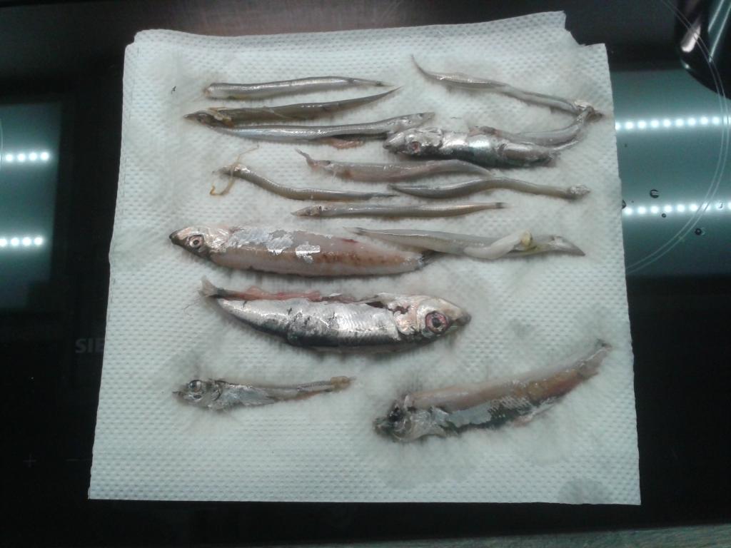 Рыбалка прошла замечательно, несмотря на парочку сходов. Домой взял одну рыбу 2,2 кг, самую большую из вчера пойманных. Один сход был конкретный, рыба была на дистанции и видать нормально не засеклась, на пол-пути ко мне помахала мне хвостом. Та что взята с собой, ударила на первом забросе. Пузо оказалось жирненьким и набитым всякими вкусностями (на фото видно). Ловили с несколько часов, сменив пару мест.