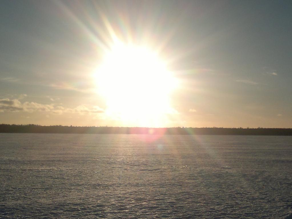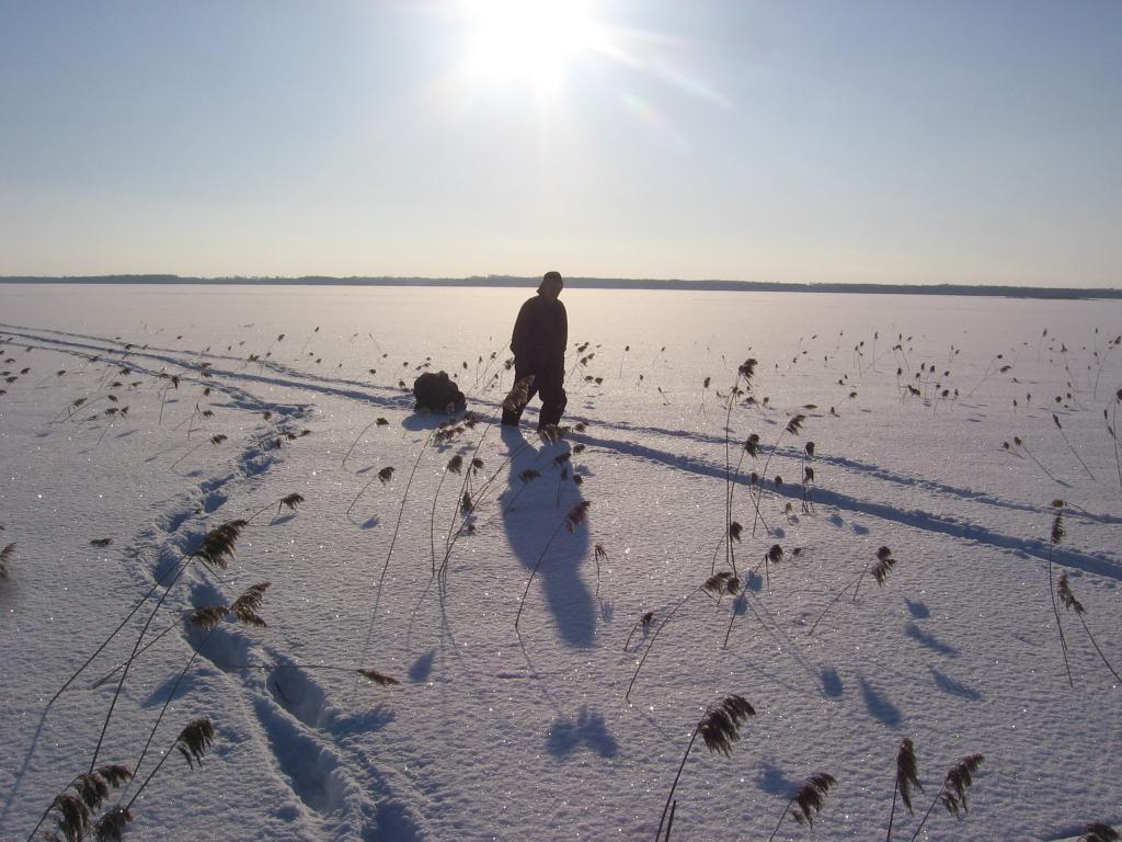 С утра на судаковую точку.Пару-тройку часов соблазняли клыкастого.Не соблазнили.А может он уже к речкам подался,подумалось. Делов-то на пяток километров.Через несколько минут там уже . Посверлились,помочили блесны-тишина. Салаца открыта,и лед метров за 150 от открытой воды не очень надежный,сильно бегать не располагал