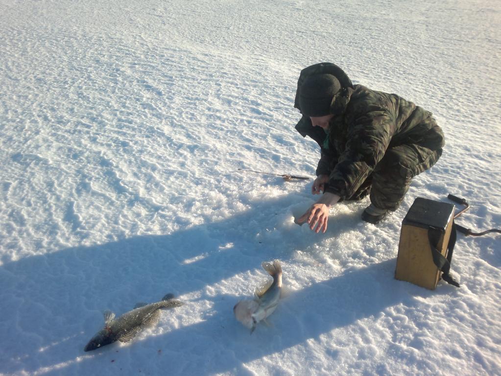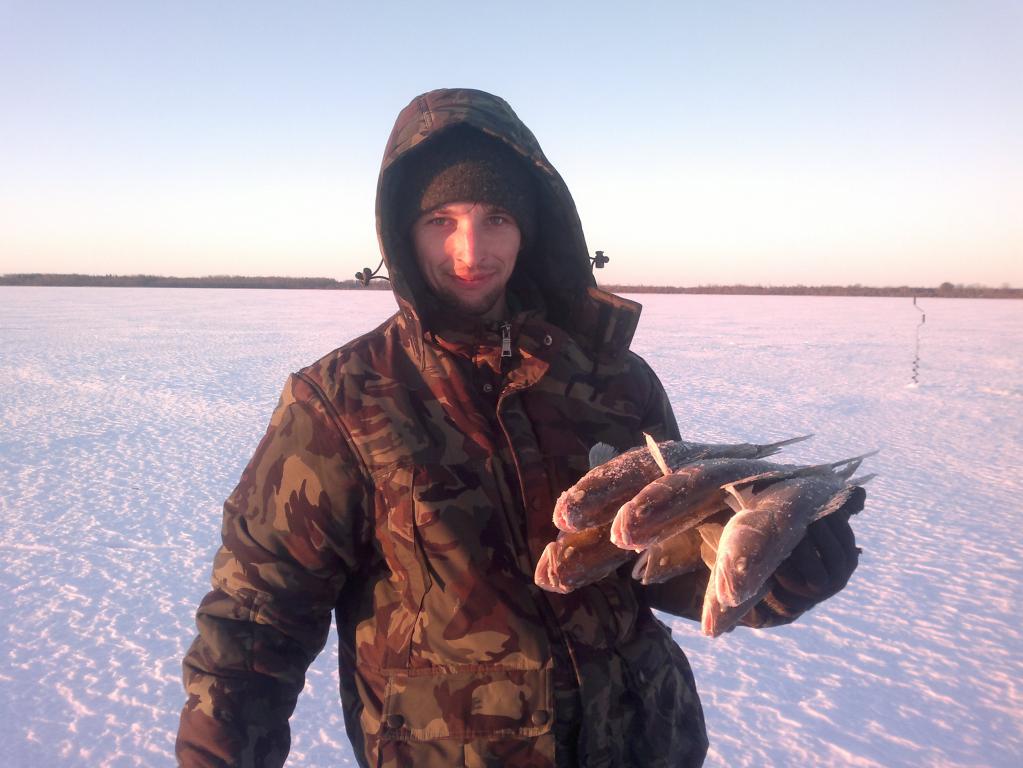 С одной стороны это и хорошо,старые лунки не замершие.Надо только их найти под снегом.А сверлится в таком льду-караул.Ножи то заточены под сухой лед.Вот так бродя по кругу и половили маленько. Почти вся рыбка поймана до обеда. Наш улов Еще парочку судачков Максим подарил менее удачному