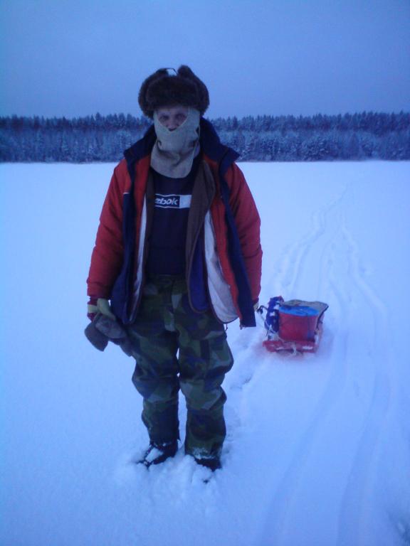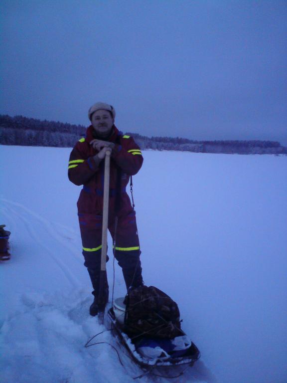 Я ведущий с пешней и в поплавке. Виктор ведомый,в грузу. Ход вполне приемлем.Толщина льда до 10см,но структура напоминает весенний.
