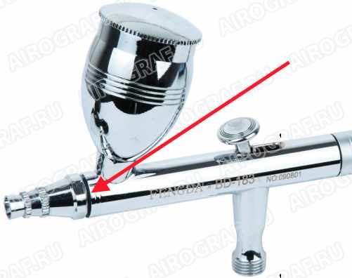 Второй вопрос. В старом аэрографе иглу всегда вставлял с носа, чтоб кончик не повредить. Здесь не получается - в тыльной части емкости для краски установлена прокладка.