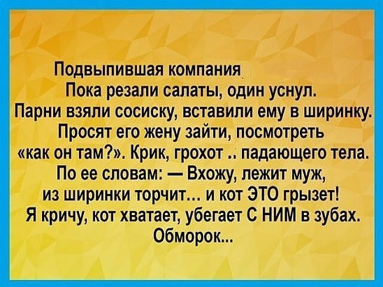 Жена пришла домой пьяная и, чтобы муж не заметил, быстренько открыла ноутбук и сидит с умной улыбкой. Муж: — Не прокатило — закрой чемодан и ложись спать!