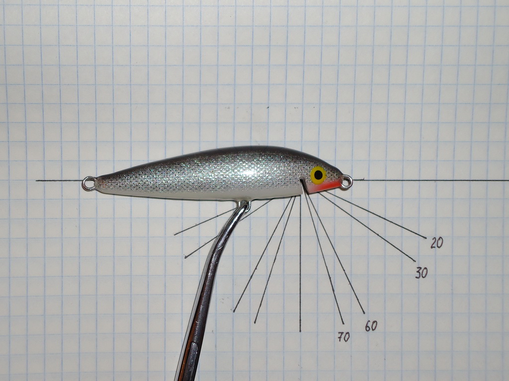 Расчерчиваю на листе необходимые мне углы. Справа и слева. Беру покрашенный и покрытый лаком воблер. Гелевой ручкой отмечаю начало прорези - черточка снизу. Выбираю угол. Прикладываю воблер к расчерченному листу. Черточка, которая теперь выглядит как точка, должна совпасть с соответствующим отрезком. Ставлю точку на воблере в том месте, где закончится прорезь. Затем воблер другим боком прикладываю и тоже ставлю точку. Затем ножом прохожу по месту, где будет прорезь, делаю надрез лака, чтобы потом ножовочное полотно не скользило. Ножовочным полотном делаю прорезь. Теперь в прорезь можно вставить что-нибудь вместо лопасти. Кусочек картона, например. Вставляю. Прикладываю воблер к расчерченному листу. Если чуть-чуть ушел от нужного угла, то наждачкой в необходимом месте стачиваю. Надфилем не подлезешь при такой толщине прорези. Если угол нормальный получился, то той же наждачкой просто довожу прорезь до необходимой мне толщины. Клею лопасть.