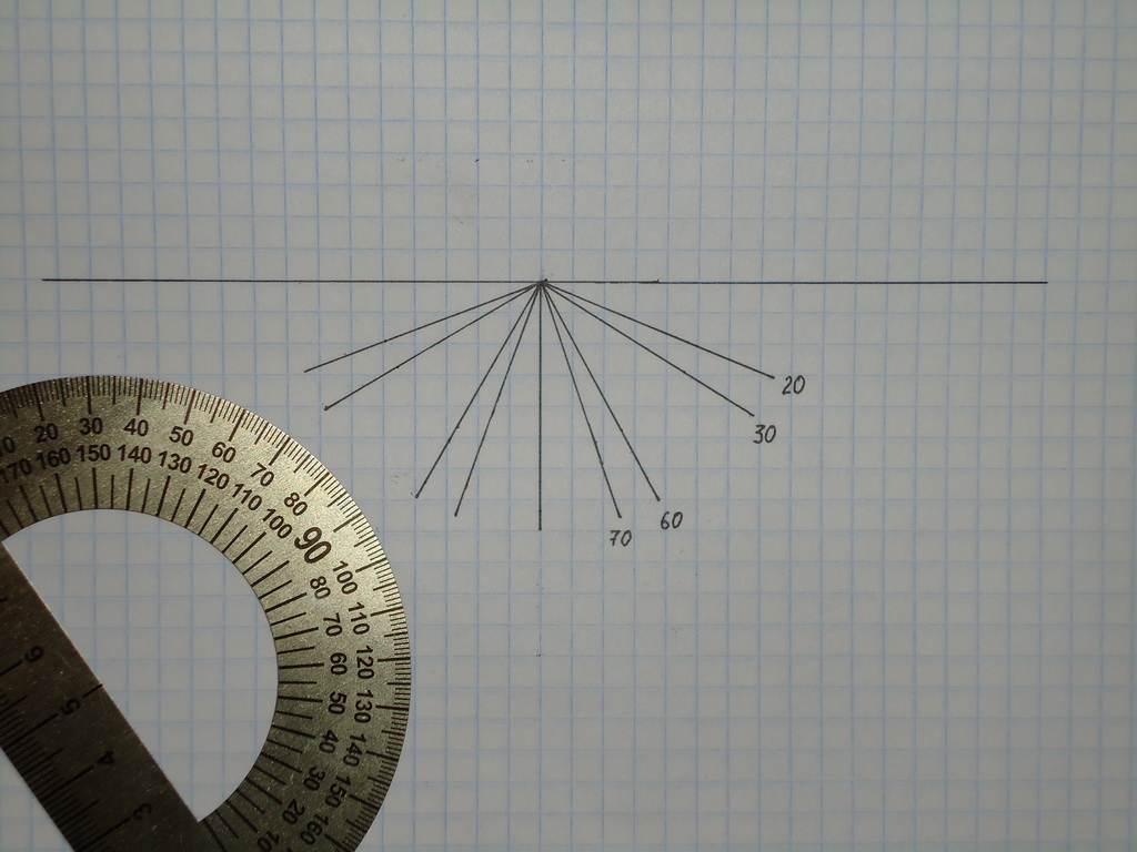 Расчерчиваю на листе необходимые мне углы. Справа и слева. Беру покрашенный и покрытый лаком воблер. Гелевой ручкой отмечаю начало прорези - черточка снизу. Выбираю угол. Прикладываю воблер к расчерченному листу. Черточка, которая теперь выглядит как точка, должна совпасть с соответствующим отрезком. Ставлю точку на воблере в том месте, где закончится прорезь. Затем воблер другим боком прикладываю и тоже ставлю точку. Затем ножом прохожу по месту, где будет прорезь, делаю надрез лака, чтобы потом ножовочное полотно не скользило. Ножовочным полотном делаю прорезь. Теперь в прорезь можно вставить что-нибудь вместо лопасти. Кусочек картона, например. Вставляю. Прикладываю воблер к расчерченному листу. Если чуть-чуть ушел от нужного угла, то наждачкой в необходимом месте стачиваю. Надфилем не подлезешь при такой толщине прорези. Если угол нормальный получился, то той же наждачкой просто довожу прорезь до необходимой мне толщины. Клею лопасть.