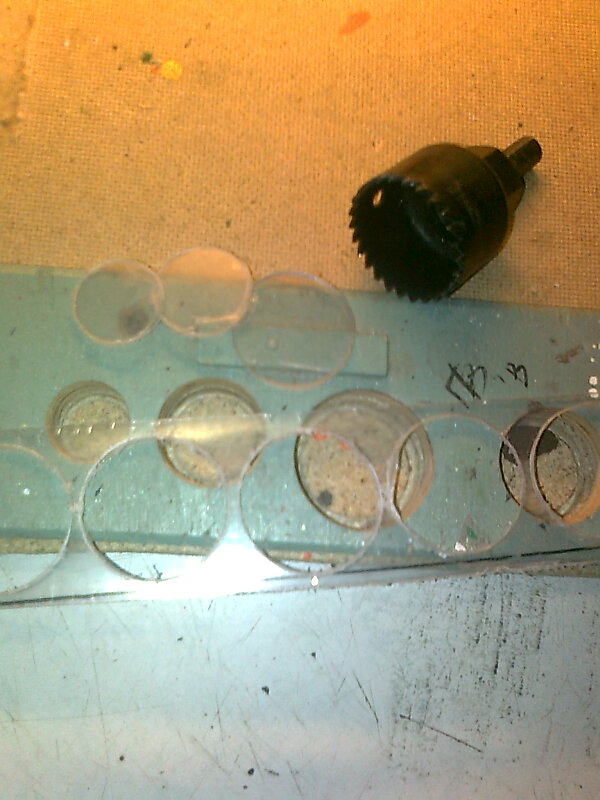 Вырезанный кругляш придерживал за кончик пинцетом и грел над огнём газовой плиты. После того как материал визуально становился мягковатым прицельно ложил его в приспособу и сверху накрывал другой. Спешки при этом никакой, т.к. остывает он довольно долго! Вот к поликарбонату требуется более серьёзный подход, оказалось, что на шару его не взять!