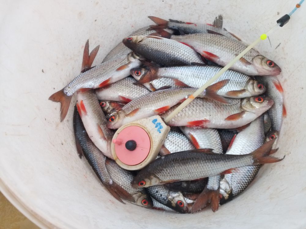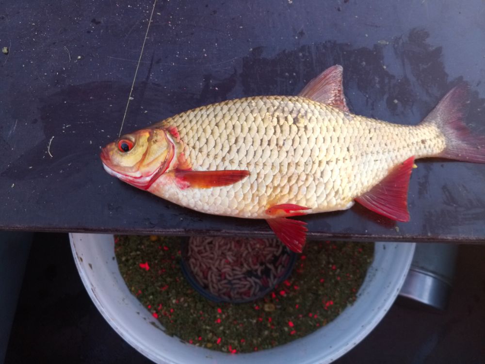Перед рассветом влетел один закилошный лещ. Вышло солнце. Всё тот же линь, весь в пузырях, стоящий на прикорме. Краснопер выносящий мозги. К слову о ней. Размер очень не плохой. Так что кто её жалует. Велком на водохрон, в тросту и ловите на здоровье. Около 7 утра приподнял садок с сиротой лещем. Развязал. Он очумелый, немного постоял, прощаясь у лодки и так же удивленно, медленно, ещё не веря вновь обретенной свободе, поплыл в родную стихию до новых встречь.