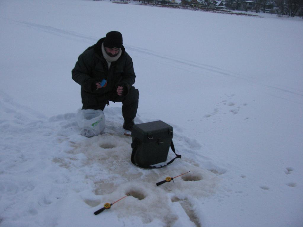 ...Погоду действительно,даже корректировав её постоянно,друзья синоптики сильно не меняли;всё складывалось к тому,что вместе с потепленем,давление,хоть и будет скакать,но боль-муль нормализуется;ветер наконец изменит своё направление на клёвое-сказка,а не условия для рыбалки.Цель-"лёгкая рыба"-"фанера"-рыбалка азартная,душу отвести.Выдержав пазу порядка недели,чесаться и зудеть,зудеть невыносимо начало во фторник....В четверг вечером попадаю в Пярну,дождь,но вечером пошёл снег,утром узнаю,что да почём.Как в детстве,нет сна перед долгожданной рыбалкой;хотя чего волноваться?-вооружон до зубов,условия рыбалок известны,места-не первый раз.И чего у меня тока нету,и мотыль наисвежайший(купленный уже в Пярну),опарыши-свежие,старые,куколки,красные белые,червь навозный,самый что ни на есть настоящий(с осени оставшийся),прикормка зимняя,атрактант,..,кормушка,донка(хоть не осбо их жалую),мармышки-кивки,на любой вкус(некоторые снасти даж приведены по уму в баланс.Чего волноваться?-Оказывается было чего.