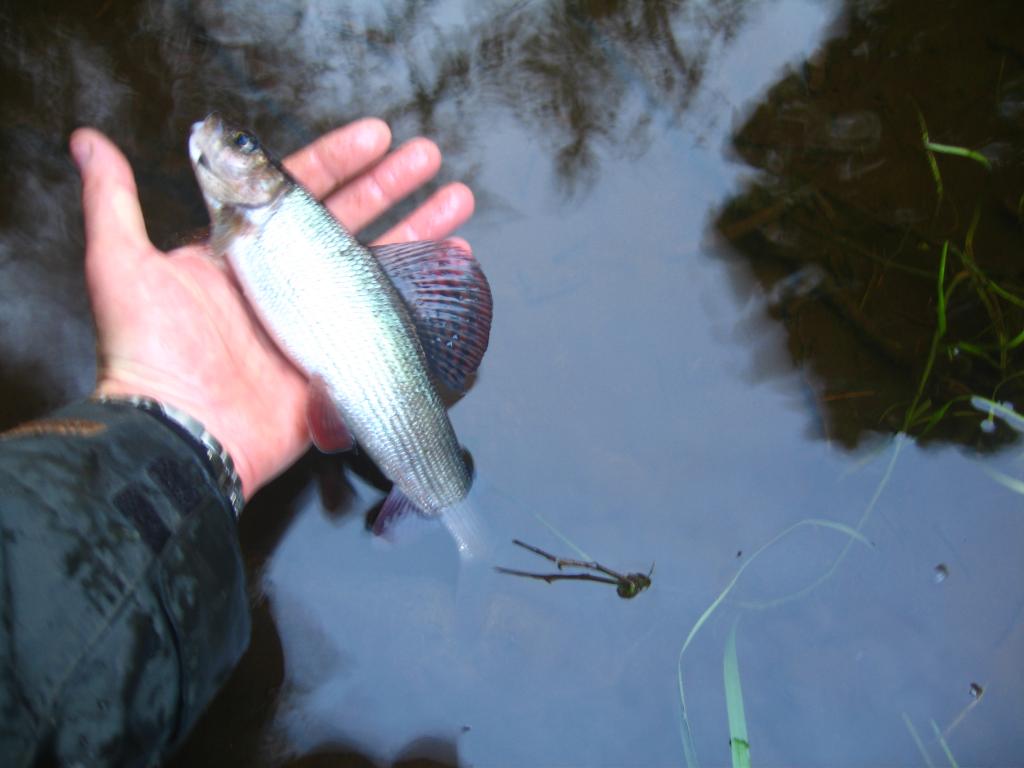 Пока солнце светило, прошелся по лесному тенистому участку с километр - полтора. Там пару рыб видел. Одна приличная с удовольствием хомячила поденку на струе за большим камнем. Сплавил туда воблерок, тут же удар, несколько вывертов, под берегом воблер цепляет траву и этого оказывается достаточно, чтобы рыбинка сбежала.