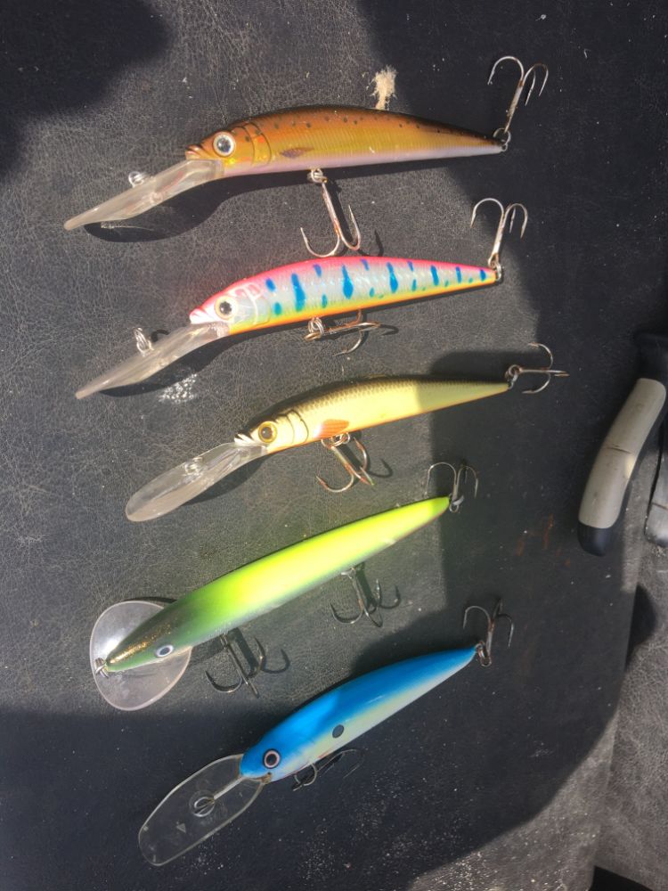 Я не жадный, покажу свои воблеры, которые были самыми результативными за выходные. Отпускал до 7 утра примерно на 20-25м, после 30-35м и в обед иногда до 60м, чаще клевало при ускорении с 4кмч до 7-кмч или же наоборот, едешь метров 50 со скоростью 5-6кмч и резко сбрасываешь скорость, после этого почти всегда загибало.