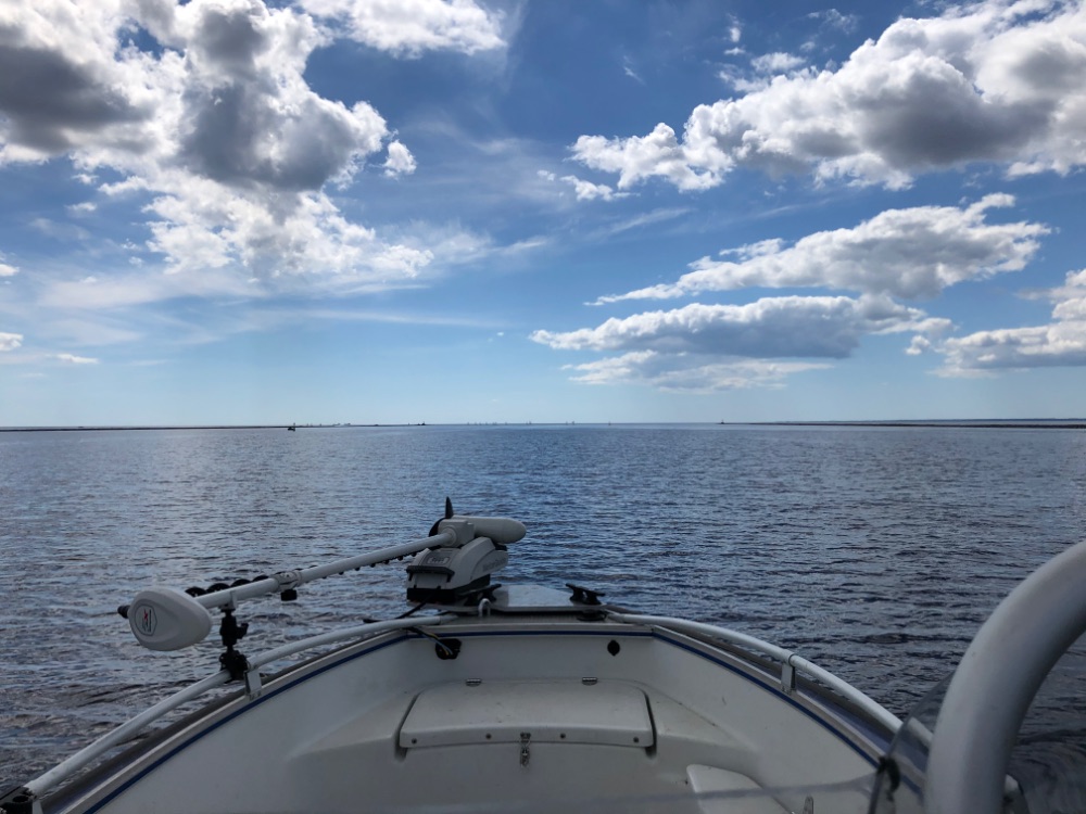 В течении дня это пятно может перемещается по акватории залива. Порой ловля в толпе приносит результат, но не всегда. Стоит отойти от толпы на пару км и можно наблюдать картину как на моей фото выше.