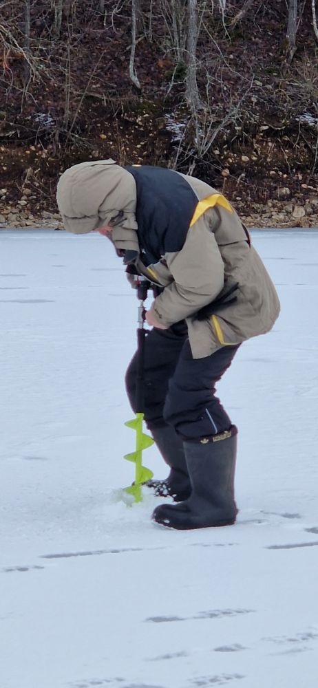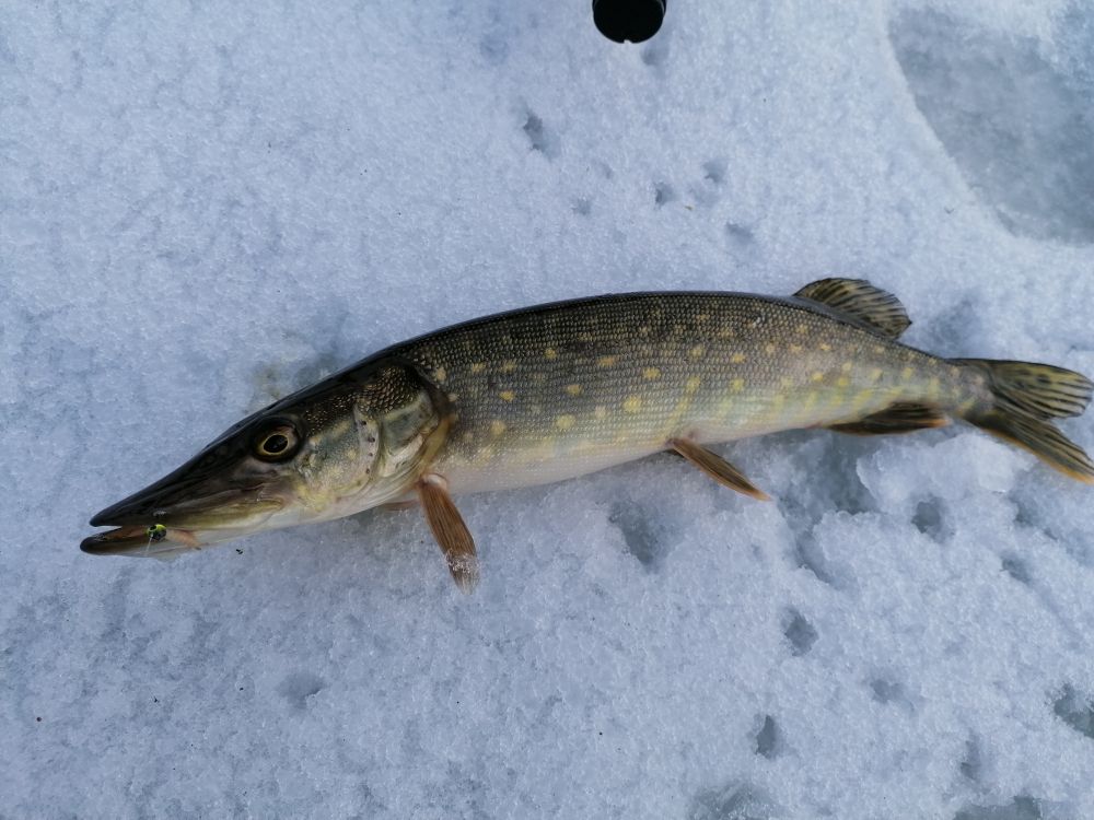 Да, грустновато. Четыре раза выбирался, а писать особо неочем. Первый раз даже выйти постеснялся из-за табличек, да и лёд довольно стрёмный был. Погонял немного мелочишку на соседнем болоте. Второй раз вышел в заводину у бани, лёд был в ней уже добрый, поэтому табличку не заметил. До обеда двух съедобных полосатиков, остальное детский сад, ясельная группа. Переехал на парковку у канала, и примерно на седьмой лунке чудом не провалился, от греха подальше ретировался. Третий раз на пару с Игорем. Все козырные места по окуню, один единственный, немного веселили щукари, но те либо откручивались, либо отгрызали мармыхи. Игорь по щуке, у него было много веселее. Флажки стреляли иногда канонадой, благодаря чему рыбы на двоих хватило. Вчера тоже вдвоём топтали просторы водохрона. Ход тяжеловат, выход с берега стремноват, лёд местами с длинну бура,у канала открытая вода. Рыб то ли в шоке, то ли в игноре, то ли ошибка с местами. За весь день изловил три окушка, три плотвичка. Под завершение уже влетел такой красавчик,