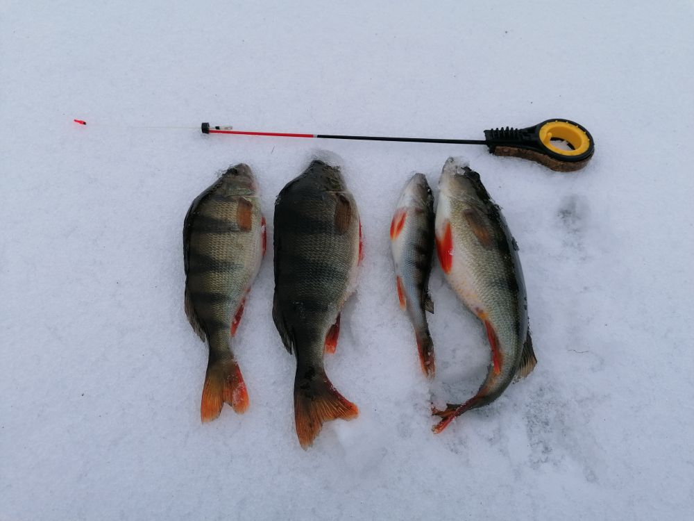 Да, грустновато. Четыре раза выбирался, а писать особо неочем. Первый раз даже выйти постеснялся из-за табличек, да и лёд довольно стрёмный был. Погонял немного мелочишку на соседнем болоте. Второй раз вышел в заводину у бани, лёд был в ней уже добрый, поэтому табличку не заметил. До обеда двух съедобных полосатиков, остальное детский сад, ясельная группа. Переехал на парковку у канала, и примерно на седьмой лунке чудом не провалился, от греха подальше ретировался. Третий раз на пару с Игорем. Все козырные места по окуню, один единственный, немного веселили щукари, но те либо откручивались, либо отгрызали мармыхи. Игорь по щуке, у него было много веселее. Флажки стреляли иногда канонадой, благодаря чему рыбы на двоих хватило. Вчера тоже вдвоём топтали просторы водохрона. Ход тяжеловат, выход с берега стремноват, лёд местами с длинну бура,у канала открытая вода. Рыб то ли в шоке, то ли в игноре, то ли ошибка с местами. За весь день изловил три окушка, три плотвичка. Под завершение уже влетел такой красавчик,