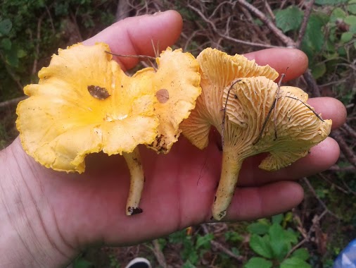 Сегодня увидел очень похожие с верху грибы на лисичек,срезал одну и убедился что такого гриба незнаю.Типерь у нас дожди идут каждый день,лисички которые растут ближе к болотам светлее немножко имеет окрас. И сверху принялза лисичек.