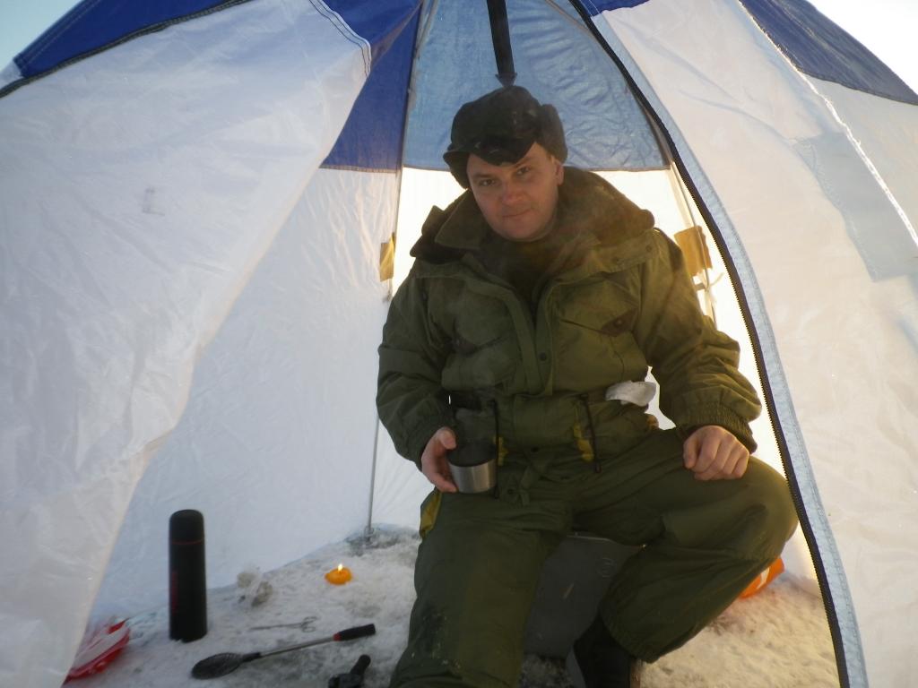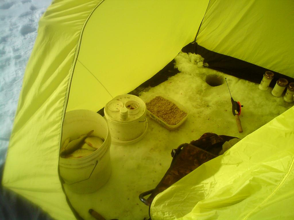 Вышли,набурили интересное место,закормились.На термометре -14*,я нырнул в палатку,приятели без юрт.