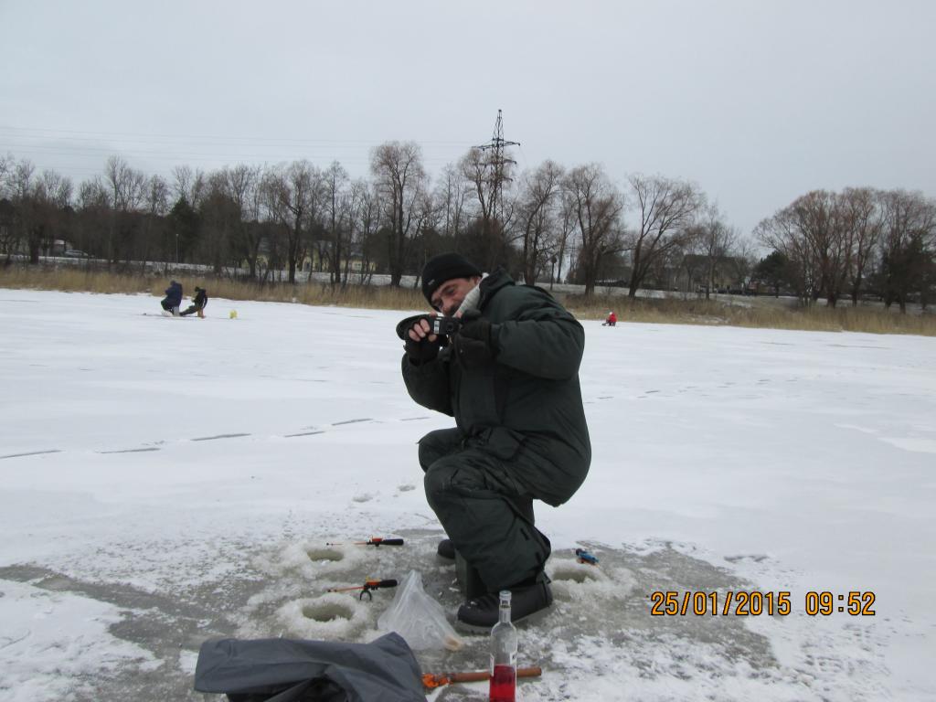 По самой рыбалке.Ушол сразу далеко.Выбрав место и по фарватеру,и в гордом одиночестве.В течении часа понял,течение более чем для комфортной ловли.Для речки разновидность снастей довольно разнообразна,но предпочтение отдал мармышке.Мог бы конечно,и собрать снасть чтоб справлялсь,есть и тонкие лески,и тяжёлые мармыхи,хорошо ложащиеся на дно,но опыт есть.Такая рыбалка скорее всего не принесёт удовлетворения.Пошол и спрятался за поворот.Среднии мармыхи даже там потягивало,самое то.До обеда нормальная плотка,с обеда похуже,нормальные проскакивали но пореже.Чтоб совсем уж скучно и однообразно рыбалка не шла, несколько раз поймал удочкой удочку,раза три зацепил кормуху,дождь до кучи измочив одно полотенце,вот уже и второе выжимаю.Жена предупредила перед рыбалкой:Зачем свинье новый комбез?-измазюкаешь пеняй на себя!Был бы я в старых штанах,руку ещё можно б об штанину вытреть,а так,эх.И отвожу я значится,леску при вываживании уже мокрой рукой,а надо выбрать метра четыре,ветер тонкую лесочку ни как ни даёт на лёд уложить.Есть петля,ещё одна.Три раза рвал,мармыху перевязывал.Об чего руку вытирал?-ну вы догадались