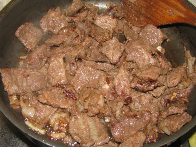Конечно выделится туева куча влаги, выпариваем ийо и уже когда выпарим и останется сок практически прозрачный, раздвинем мясце по краям и метнем в середину здоровенную луковицу, порезанную четвертинами и потом мелко нашинкованную. Прожарим и все перемешаем, и мясо и лук должны чутка зазолотицца, а можно в принципе и не чутка. Солим перчим.