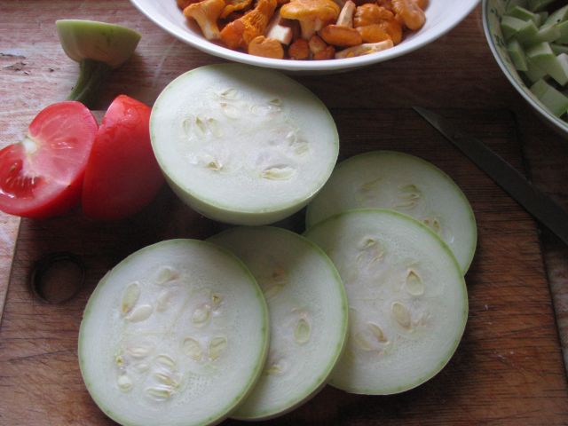 Пока суть да дело, выходим на двор и трусим к огородцу. Режем по дороге махонький кабачог, заходим в тепличку и срываем памидор, ну там зелень тож нащипаем походу.Шинкуем кабак тонкими ломтиками вдоль да поперек, ну и помидор тоже не забываем.