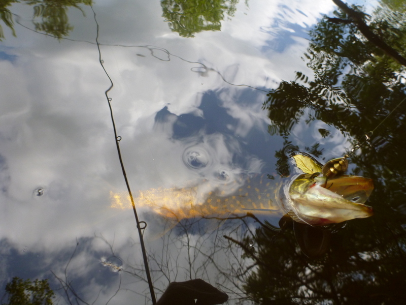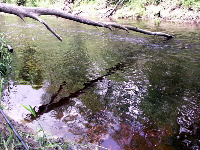 Воды в реке практически нет. Просто форелевая канавка. У меня на пути небольшой перекатик с множеством островков и струек между ними. И началось! Началось за всё, что было пропущено и упущено. За минут десять я поймал двух щупачков и штук пять голавликов. Не могу сказать, что больших, лиш один был грамм под восемьсот, но это было что то! Поклёвки ударные, погони, выкрутасы всякие, вобщем самый бальзамовый "БАЛЬЗАМ" на душу! Рыбу я отпускал, ведь в переди меня ждут места с жирняками. К чему это детоубийство, да и до вечера ещё вроде далеко. Рыбу снимал не беря в руку стангами прямо в воде. Возможно всему дальнейшему пустому маршруту была виной малая вода, может ещё какая то напасть, но после небольшого участка переката я поймал только щучку около полторашку и видел с пяток поклёвок заполкилошных и подкилошных голавлей. Вернулся уже тёмной ночью а рыбы в лагере нет. Стас вколол несколько окушков незаслуживающих внимания а Андрика тарпоны видать из-за малой воды слиняли в более глубокие места. Пришлось кормиться всякой домашней снедью и желающим пить чай.
