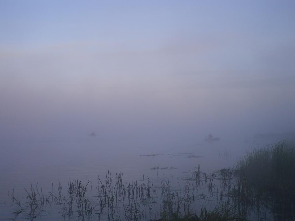По приезду были удивлены кол-вом машин. Которые судя по стёклам ночевали тут с пятницы. В тумане с берега проглядываются очертания лодок. Но видно, что червячат. Ясно. не конкуренты. Погодка, практически штиль. Первые поклёвки не стали себя долго ждать, но размерчик совсем не коптильный. Но потихоньку стало раздувать, не сильно, но для рыбалки самое то. И рыбка покрупнее сразу проявилась. Открылась ещё вот такая картинка, ночников.10-12 лодок на пятаке. Кого то ловили. И если мы думали что они не конкуренты, то сильно ошибались. Лёгким движением руки удочки перевоплощаются в спиннинги, и рыбак переходит в следующий ранг, из поплавочника в спиннингисты- тролиндизды