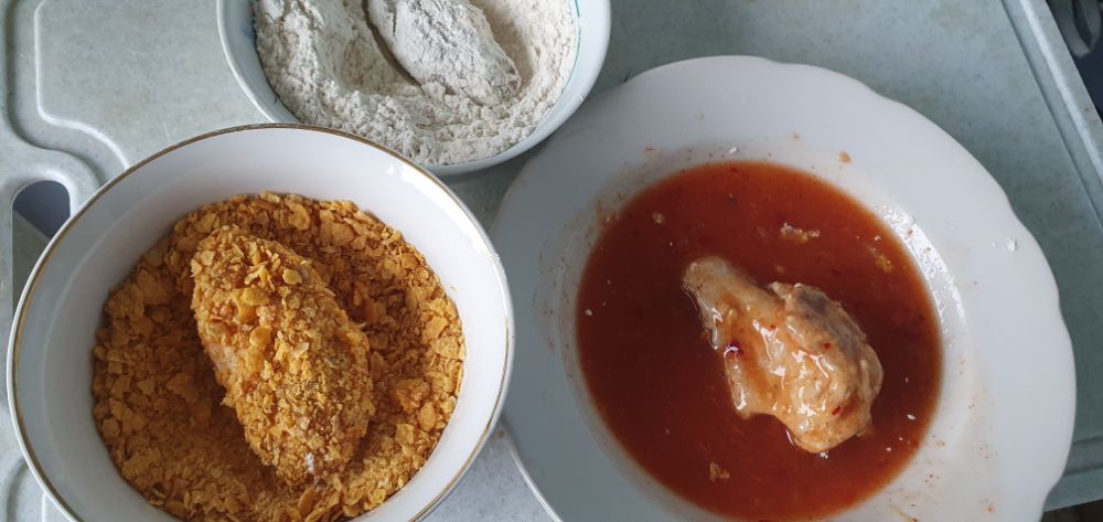 Теперь самая главная хитрость, берём муку, яйцо и острый соус чили (+ любые специи и соусы по желанию и ра вкус) в одинаковых пропорциях перемешиваем, а также главный ингредиент кукурузные хлопья без сахара и глазировки, предварительно измельчаем их в пакете рукой или скалкой, можно без фанатизма блендером крутануть в крошку.