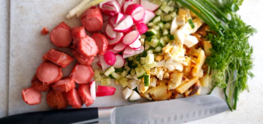 Сам квас в тарелке поперчил и посолил, добавил картошку печёную а аэрофритюрнице, огурец, редиску и сосиску жареную в аэрофритюрнице, кресс салат (прикольная травка с вкусом хрена, горчицы и редиски одновременно), петрушка, укроп и зелёный лук.
