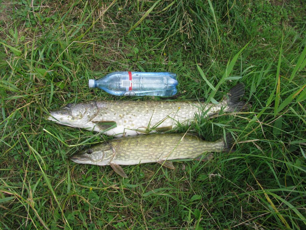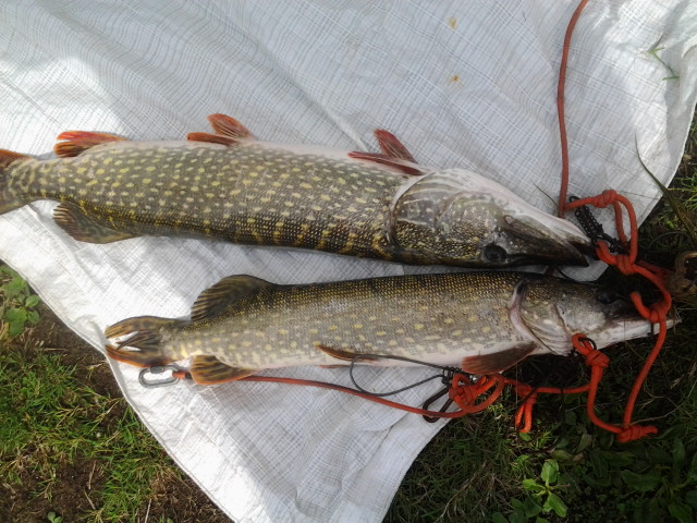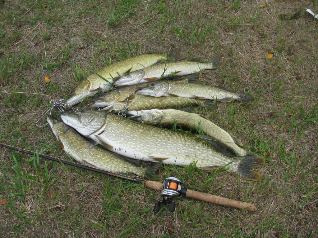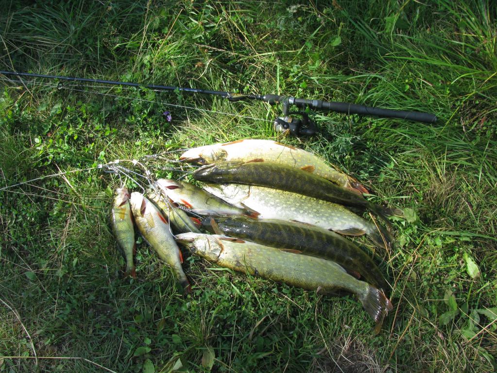 Так и стал в этом месте ловить. Смещаюсь 5-10 метров и опять кидаю во все стороны блёсна. Вода мутная, стал ставить блёсна с более активной игрой. Помогло. Только размер пойманной рыбы не очень большой. Выбрал блесну самого большого размера которую можно провести через траву и дело пошло лучше. Одна щука уже не кукане и жаба потихоньку маня отпустила. Ну и я отпускаю пойманную рыбу. Напоследок повесил ещё одну рыбку на кукан и хватит. В следующий раз надеюсь поехать с кем нибудь. А то одному всё таки скучновато.