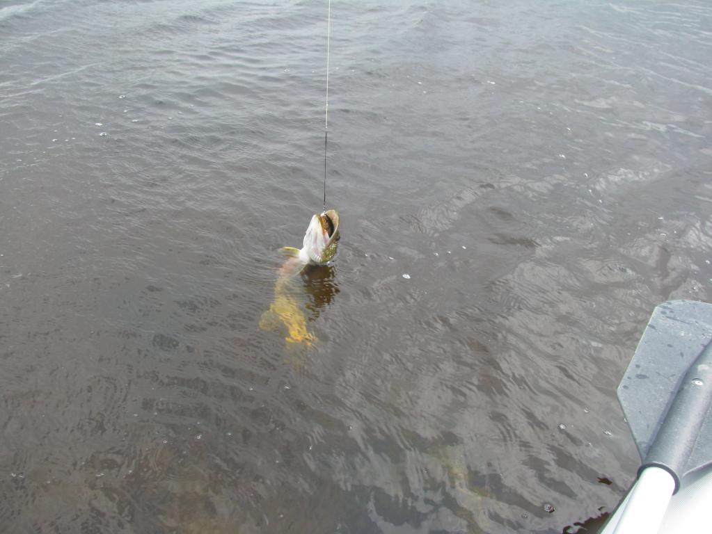 Сразу пошёл дорожить на прошлую точку. А вдруг опять такая удача. Погода радует. С утра штиль, потом поднятся небольшой ветерок, тучки гуляют а между ними проглядывает солнышко. Делаю остановки, несколько забросов по сторонам и дальше. Постепенно приближаюсь к намеченному месту. Пройдя точку примерно 50 метров удар. Села хорошая рыбка. Вытащил из воды, отцепил слайдера и? В прошлый раз решил всех отпускать. А как? Такая достойная и наверно вкусная. Жаба меня задушила и повесил её на кукан (щуку), а жаба так за шею и держится.