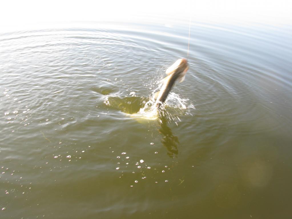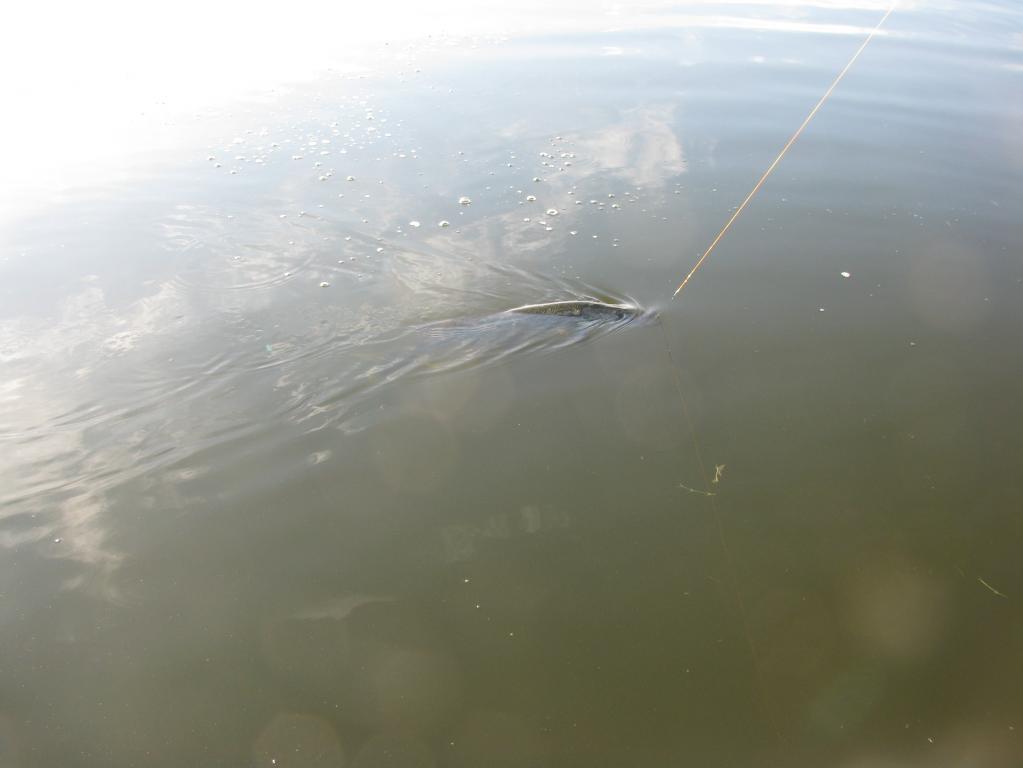 И вот в 6,30 я уже на воде. Погодка - сказка. Штиль, тепло, солнышко прячется за тучками. Вода прозрачная. Глубина 30-40 см и всё дно покрыто ровным стоем водорослей. Даже глазу не за что зацепиться. Где ловить? А рыба тут есть? Так вот на ровном поле и бродил. Успел поймать 5 штучек, а потом тучи ушли и рыба вообще брать перестала. Поставил поверхностный воблерок и стал ловить на дорожку. Несколько поклёвок и два схода. Крупной рыбы не видел. Все околокилошные, и ещё два карандашика были амнистированы