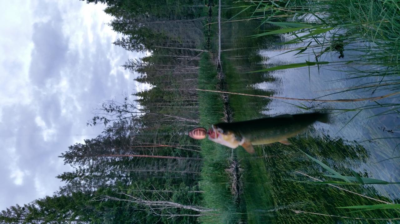 Вчера уже под вечер выбрался на один ручеек. Рыбы видео много, но за бобры делают свое черное дело - за год сильно расплодился окунек, почти каждый заброс в любой точке целая стая провожает приманку. Сами рамером чуть больше воблера. В одном месте выход явно не окунька внушил надежду. Но дальше в этом месте опять матросики. Через несколько сот метров из под классической крыши хорошая поклевка и серъезное сопротивление. Пятниская бестия чуть меньше килограмма. Потом на повороте за воблером выход, но без продолжения. Меняю на колебалку и на приводнении цоп. Закилошка. Быстрое фото и аккуратно обратно в воду. С трудом но поплыла. Надеюсь, выживет. Потом в сумерках еще несколько выходов, но уже помельче. Несколько окуней покрупнее тоже прицепились между матроскиными. В глубоких сумерках дошел до машины.