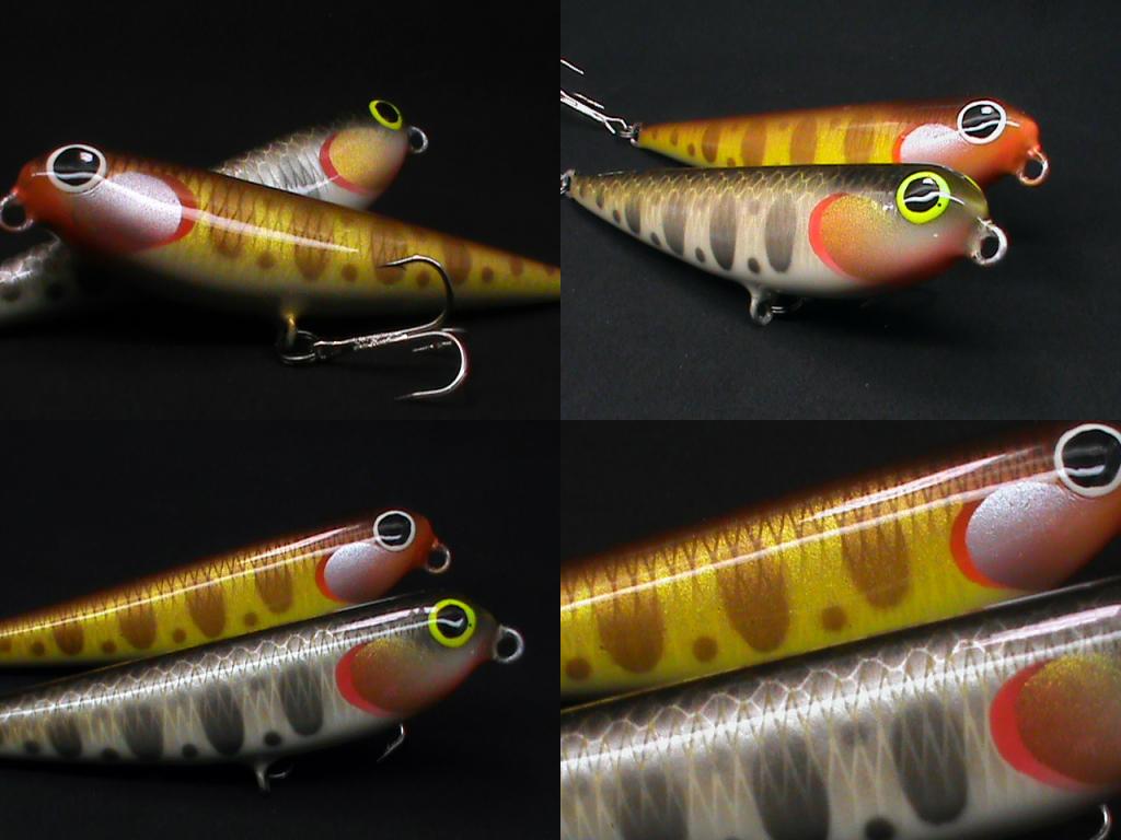 Только после всех ветеранов, не имею морального права. А как получилось покраска мне тоже понравилось. Во первых в белую с серебром краску, которой предварительно крашу приманку, добавил белую деколу флюоресцентную. Во вторых разбавлял краски очень жидко.В третьих, после последнего слоя белого пропионата почистил кольца от наплывов и для обезжиривания макнул в чистый ацетон, поверхность стала ровной и глянцевой. В четвертых раньше перед покраской шкурил мелкой наждачкой, эти после ацетоновой ванны сразу покрасил. В пятых, сделал на компе в пайнте рисунок всех воблеров, и потом по нему красил, очень освобождает голову.Guly писал(а):Сергей! Пора тебе в "Личные выставки