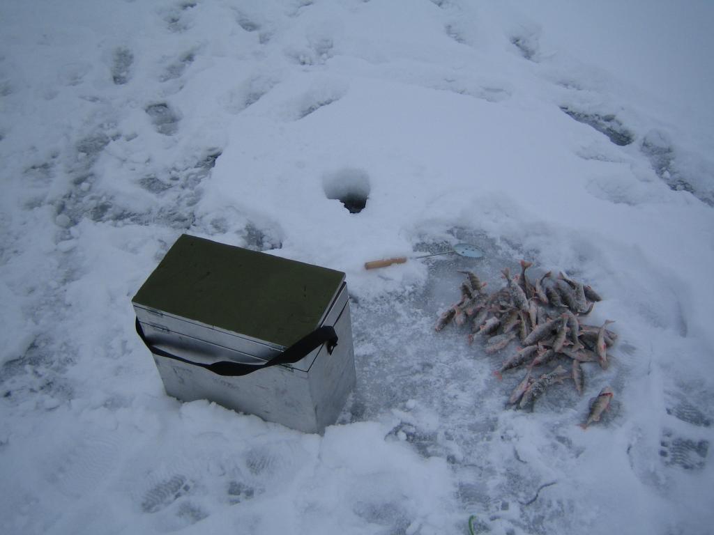 В субботу решил проверить одно озеро , точнее одну конкретную горочку в 17 метров – папаня мой там ловил шикарных окуней. Вооружился эхолотом , поколдовав с компом вычислил примерное местонахождение горочки – забил точку в навигатор и вперед. Поехали вдвоем с братом. На озеро прибыли как раз с рассветом. Навигатор показывает 800 метров до места. Первая лунка – промах - глубина 22 метра. Скидываю куртку и бурю лунок 10 шагов через 20. Эхолот в руки и вперед лунке на шестой нахожу-таки 17 метров. Опускаю блесну – пара взмахов и удар, мимо – еще пара взмахов – удар и…. мелкий окунек трепыхается на льду. Начинаю экспериментировать – меняю блесна, игру – сверлю лунки. Результат все тот же – мелкий окунь. С берега подошел брат – там тишина полная. Присоединяется с балансиром – результат такой -же – редкие поклевки мелкого окуня. В общем часов до двух подышали морозным воздухом, потаскали окушков да и домой поехали –благо ехать то совсем близко. А за горбылями мы сюда еще вернемся.