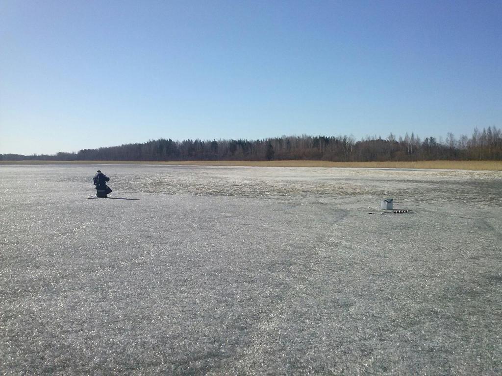 До самого озера не доехать – оставили машину на обочине – и по лесу дотопали до озера. По озеру ход средний – местами наст держал, а местами нет. Приятно удивила чистота воды, летом вода более мутная – торфяник. Разбежались в разные стороны – я пробурил лунок 20 – странно, но лед нетолстый. Перепробовал кучу разных балансиров – ни одного ударчика. Убрал поводок – не помогло. Рыб кормиться не хотел. Напарник успел проверить лунок 40 результат нулевой. Так и поехали мы домой – подышав воздухом и погуляв на природе. Заметил не в первый раз – очень чистая вода плохо сказывается на результате рыбалки.