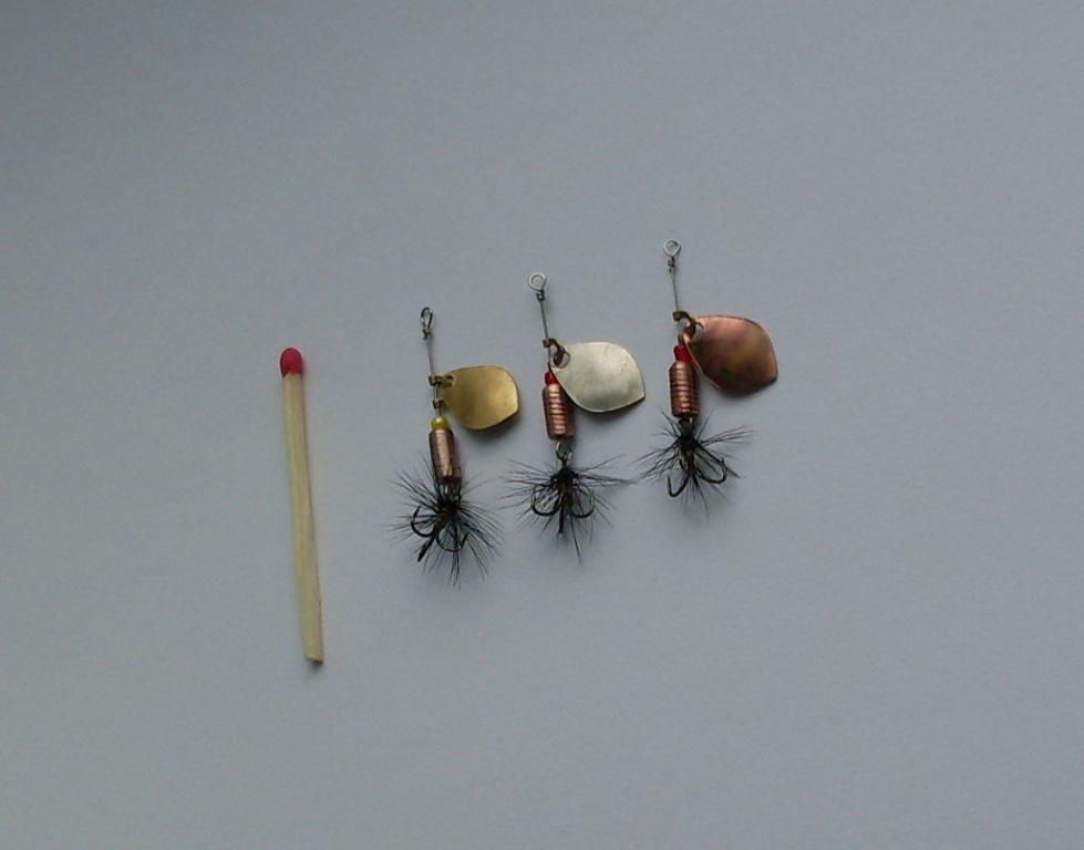 Наделал немного УЛ вертушек, проволока нержавейка, сердечник из медной проволоки обмотаной вокруг иглы и пропаяной оловом, хомут - латунь, лепестки латунь, медь, нерж. Вес в среднем 1 грам. Мушки на тройнике также самодельные, перя от скальпа петуха.